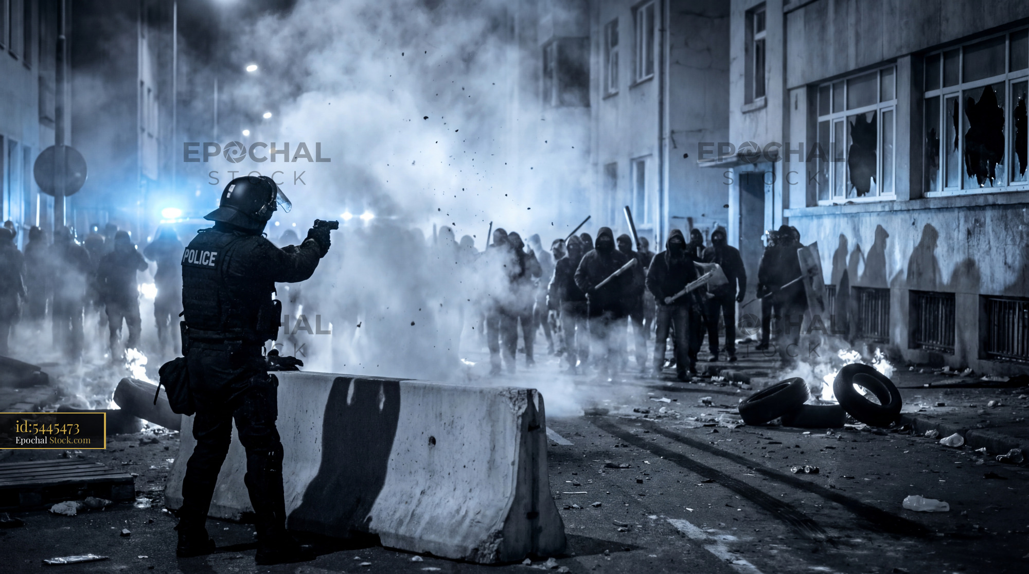 At night in a city, a police officer stands with a weapon drawn as smoke fills the street. A crowd of people confronts police amid broken windows and debris. Tension is high.