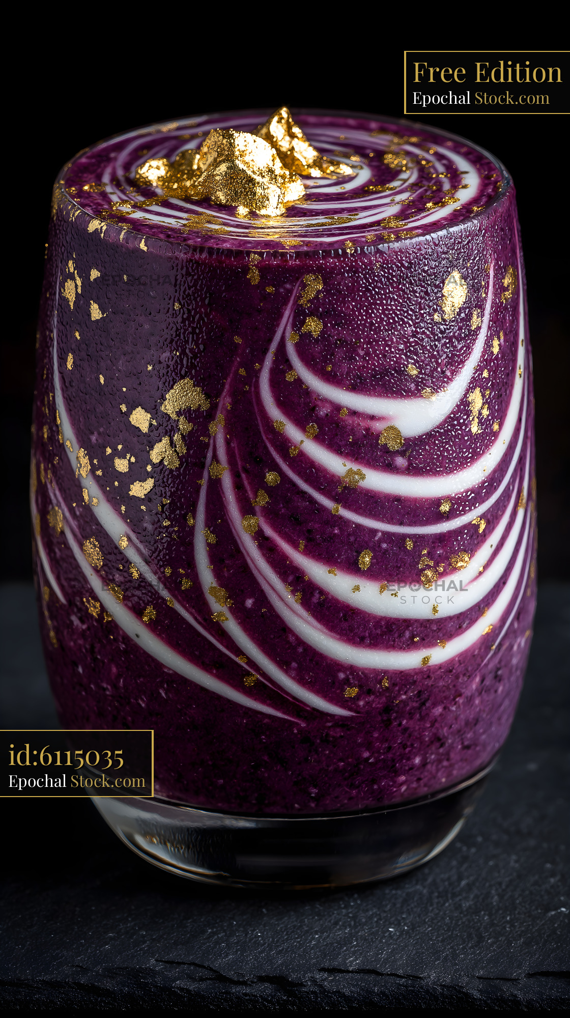 A glass filled with a purple smoothie shows a swirl of white and is topped with gold decoration. The drink sits on a dark surface, highlighting its rich colors.