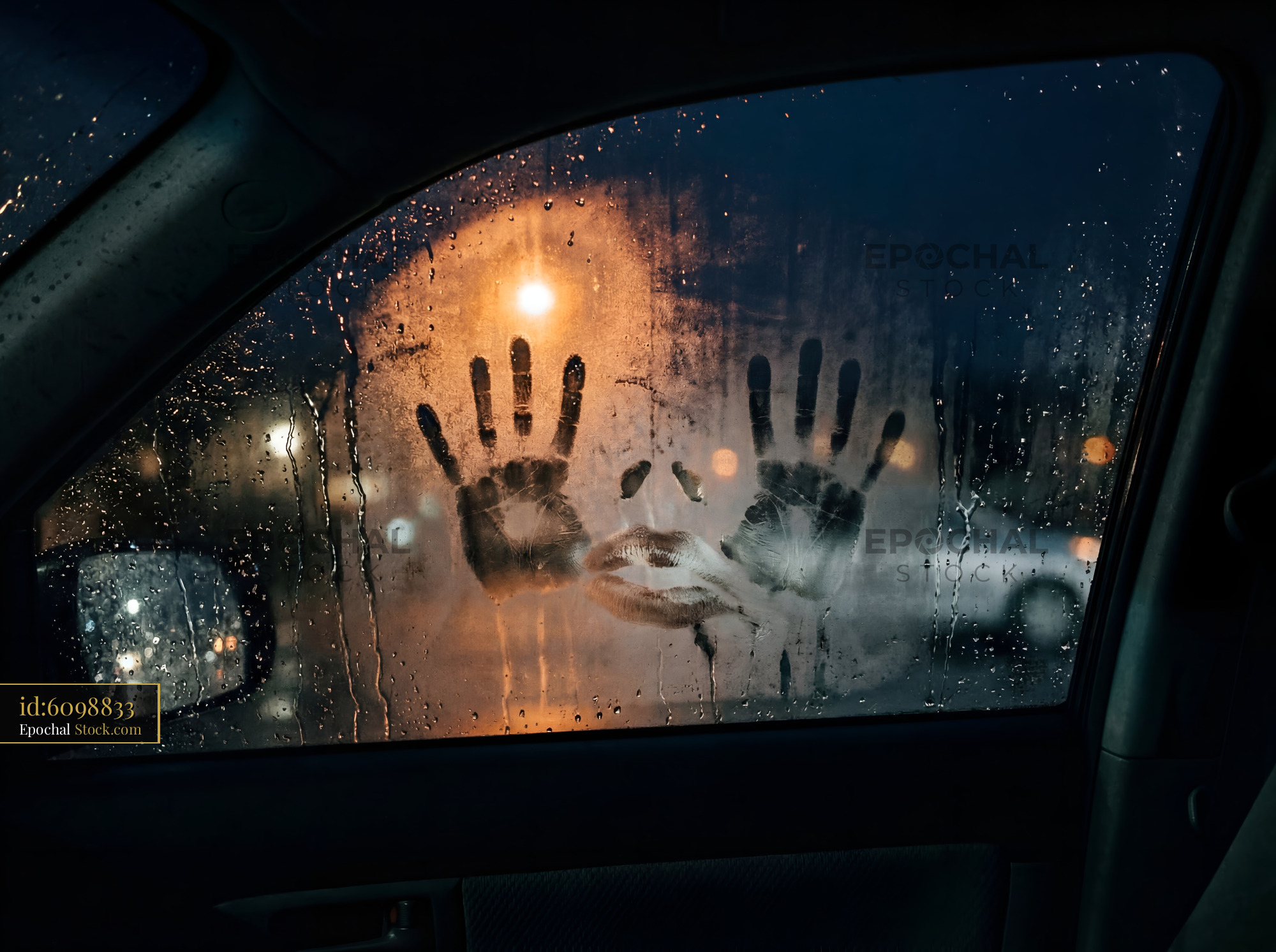 Droplets of rain fall on a car window. Handprints are smudged on the glass. A streetlight glows outside, creating shadows. It is dark and wet outside.
