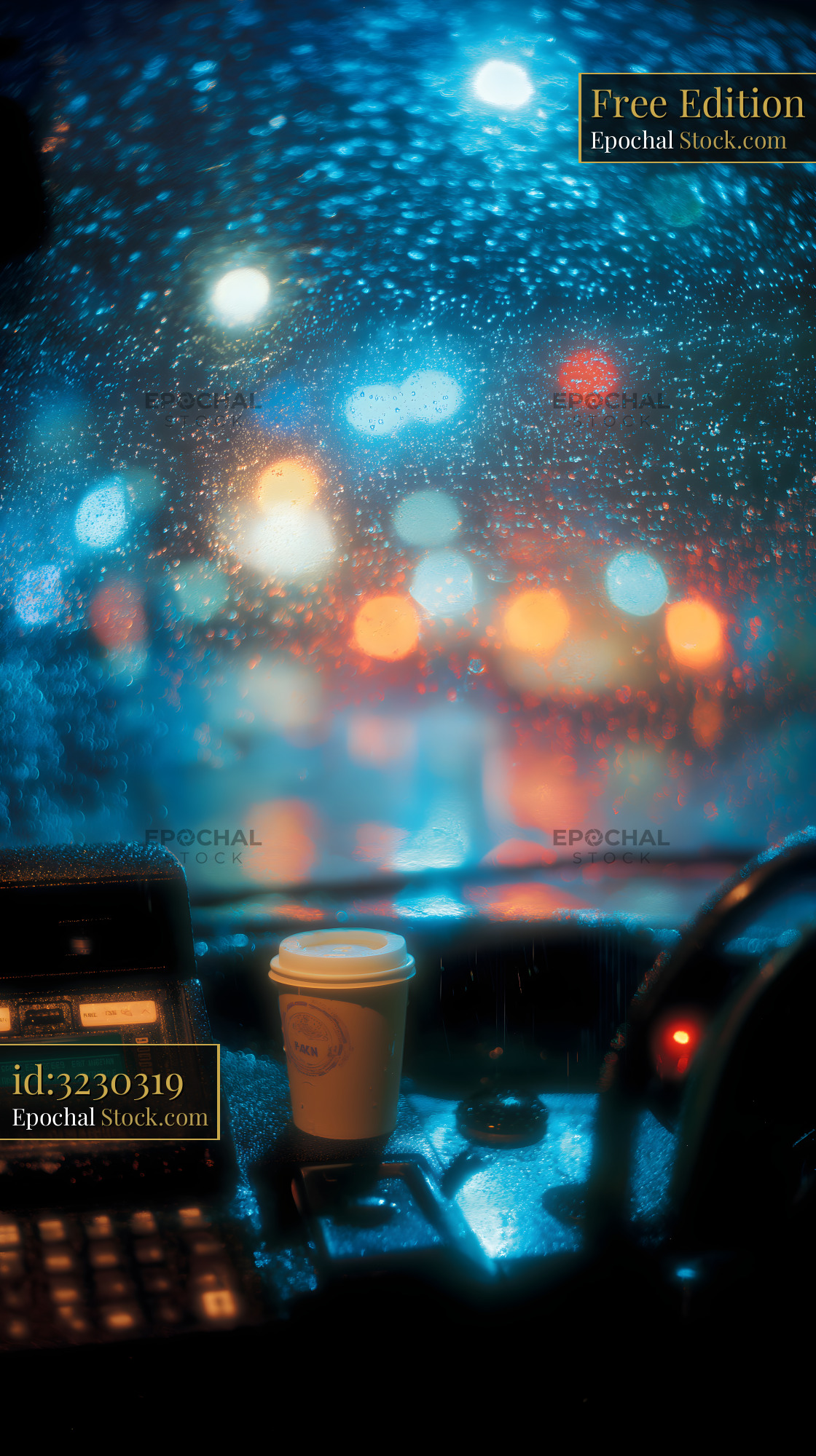 Rainy night in the city from inside a vehicle with coffee Free Premium Stock Image