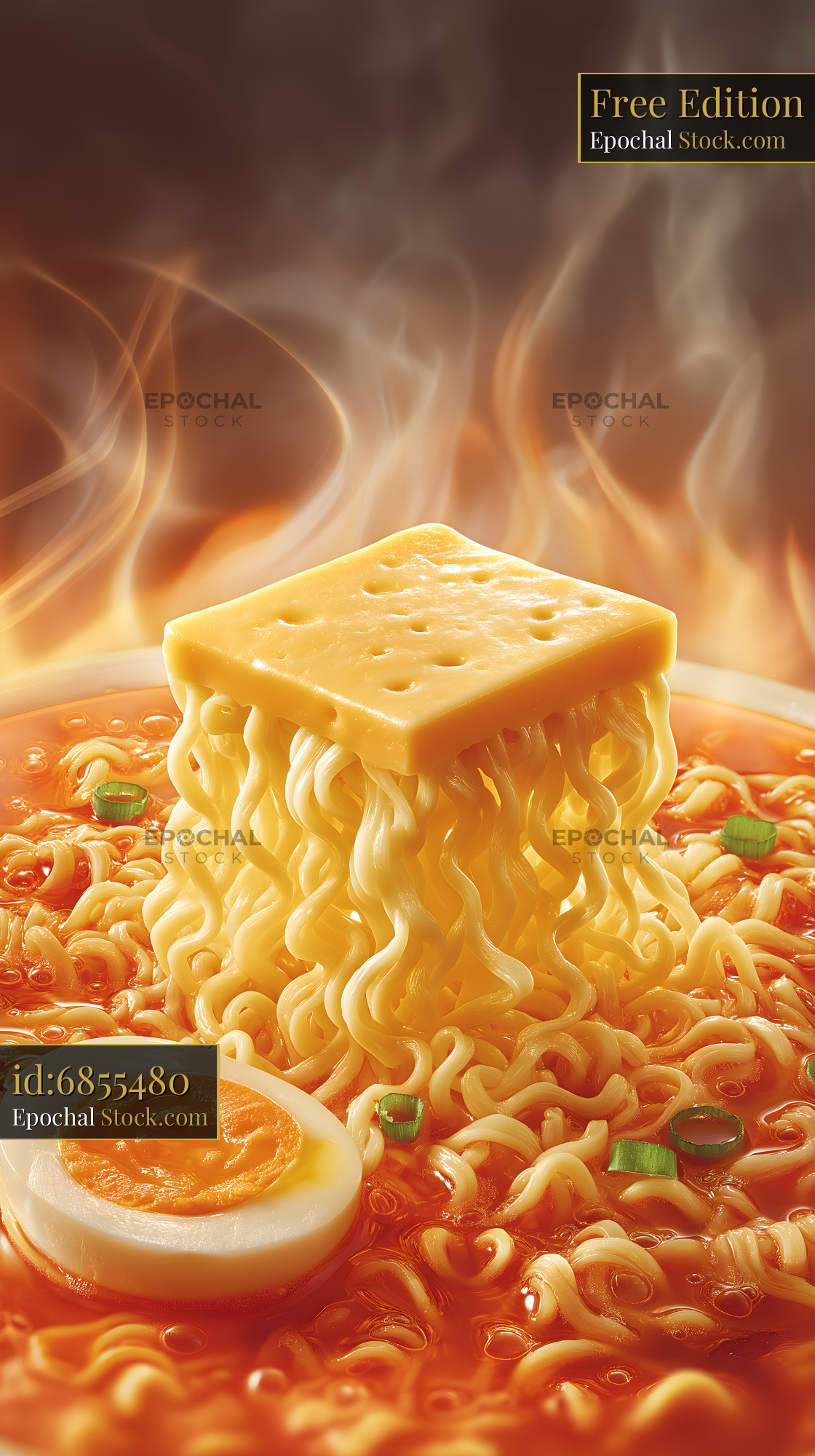 Steam rises from a bowl of ramen noodles. Cheese sits on top of the noodles, and a sliced egg is placed beside them. The broth looks hot and spicy. Chopped green onions add color.