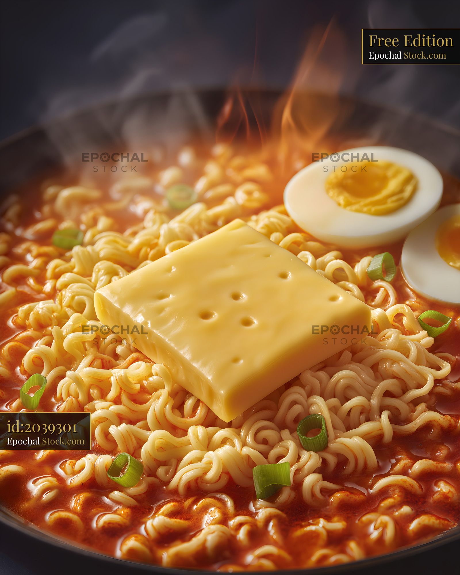 Ramen with cheese and hard boiled egg in a bowl on table Free Premium Stock Image