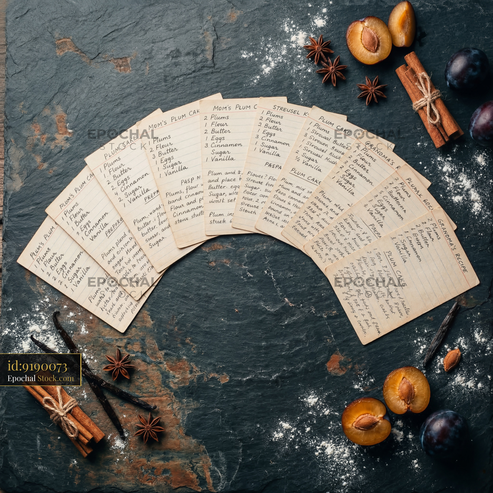 Several recipe cards are spread out on a dark stone counter. The cards contain various recipes, including one for plum cake. Nearby are ingredients like cinnamon sticks and fruits.