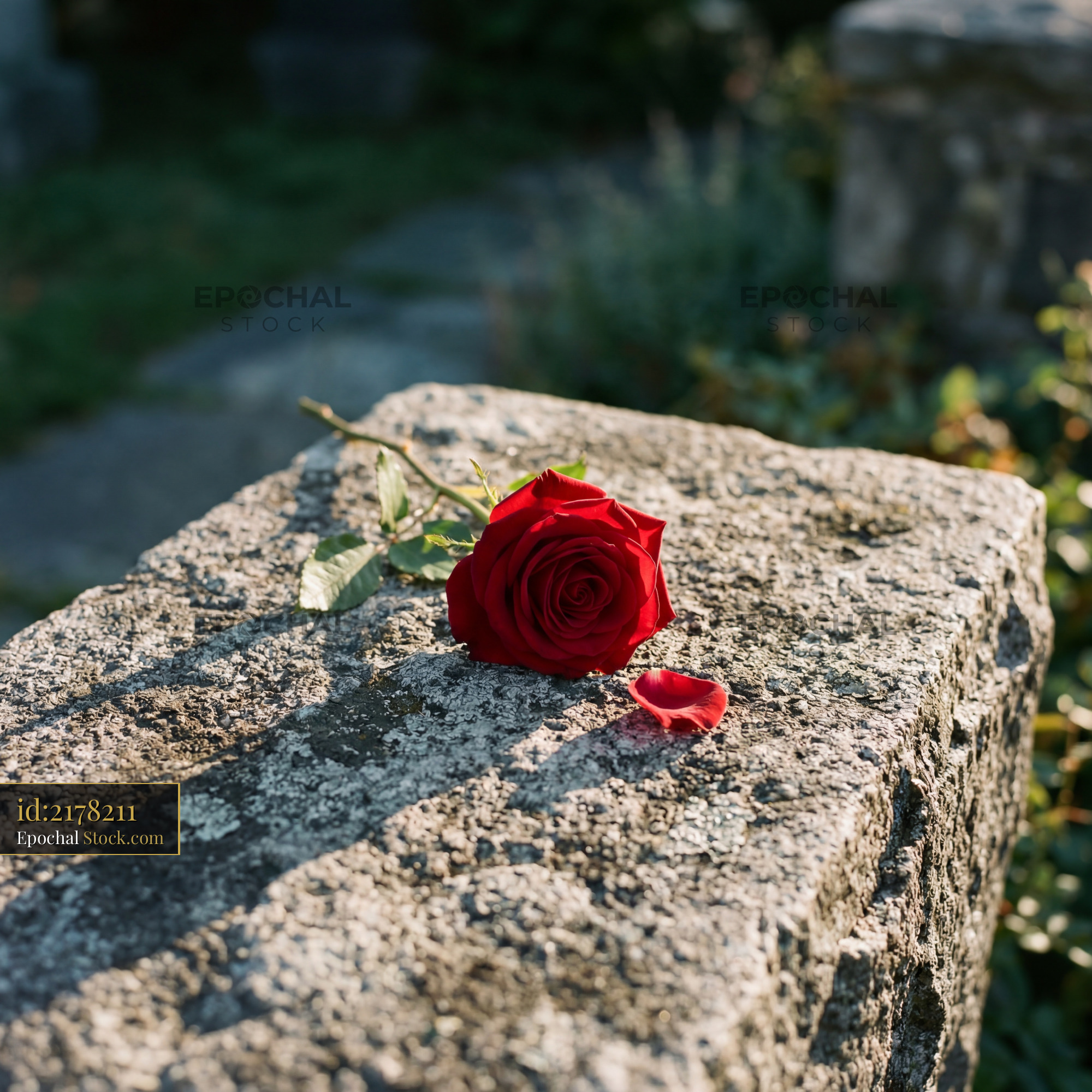 A red rose lies on a stone surface. One petal sits next to the flower. The scene is outdoors, lit by natural light, creating shadows on the stone.