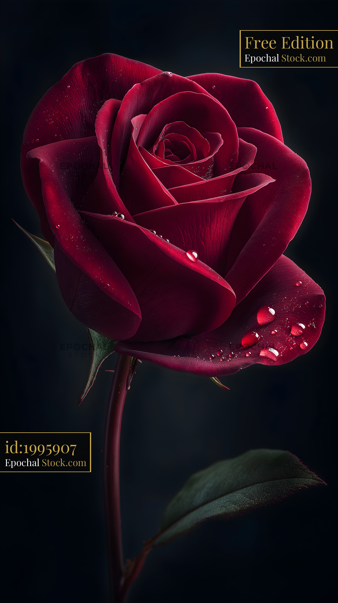 A red rose stands alone against a dark background. Water droplets rest on its petals, highlighting its shape. The scene focuses on the beauty of the flower without distractions.
