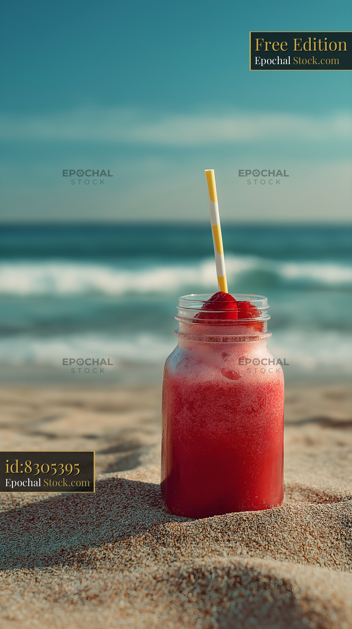 A drink with a straw sits on the sand near the water. Waves can be seen in the background under a clear blue sky. It is a sunny day and the drink looks cool and inviting.