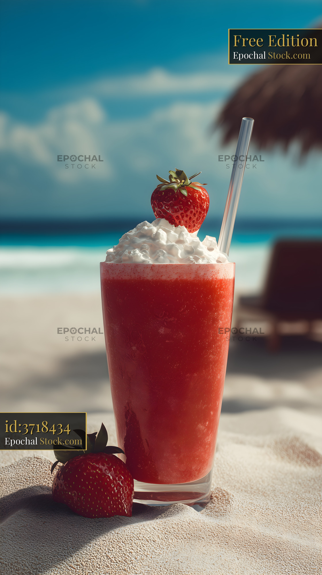 A drink made with blended strawberries and cream sits on a beach towel. Two fresh strawberries are next to the glass. The ocean and sky are in the background.
