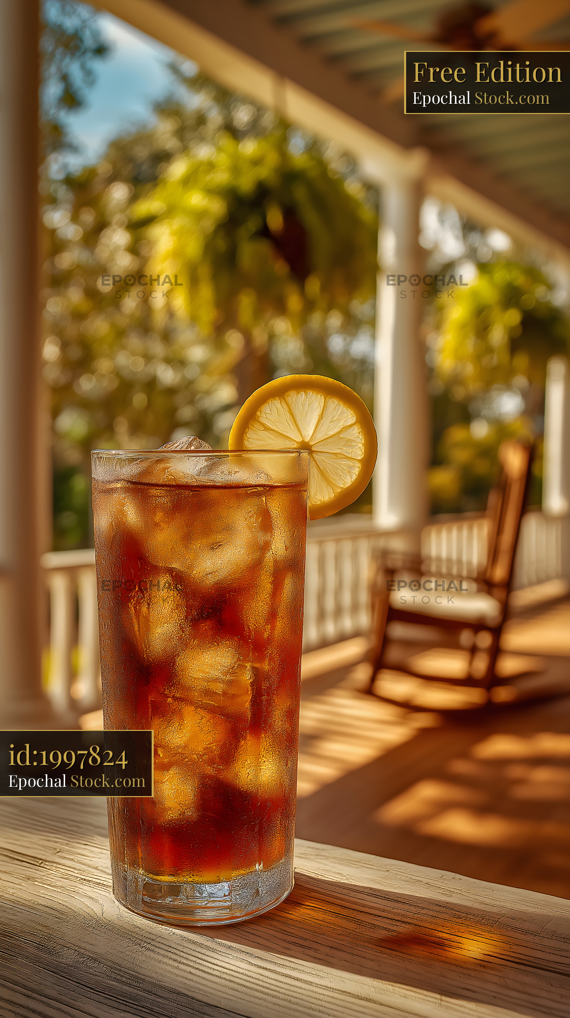 A glass filled with iced tea and lemon sits on a wooden surface. In the background, a rocking chair and plants decorate the porch under bright sunlight.