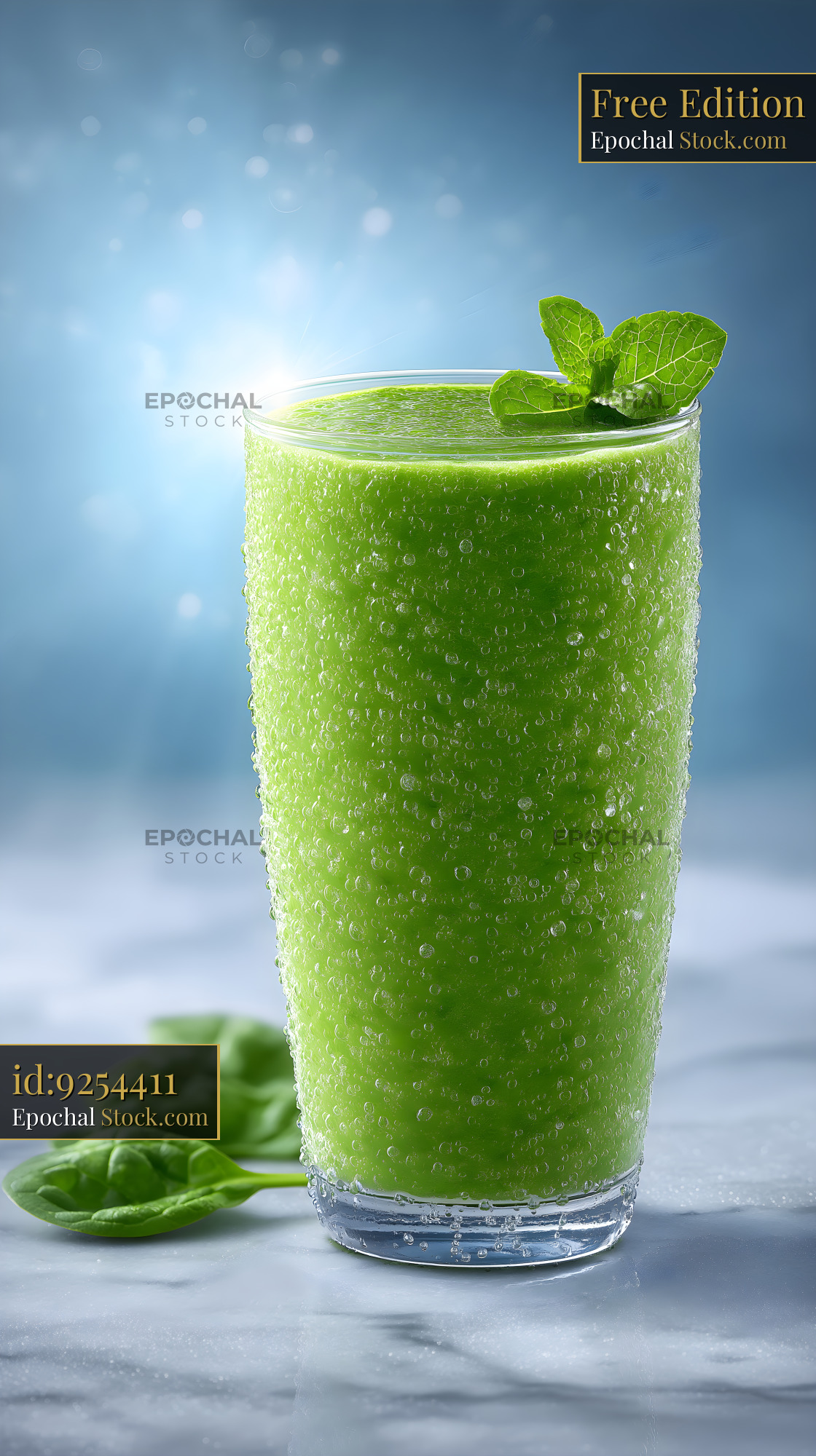 A tall glass filled with a green smoothie sits on a marble surface. Bubbles cover the glass, and a mint leaf rests on top. Fresh spinach leaves are nearby. Bright light shines in the background.
