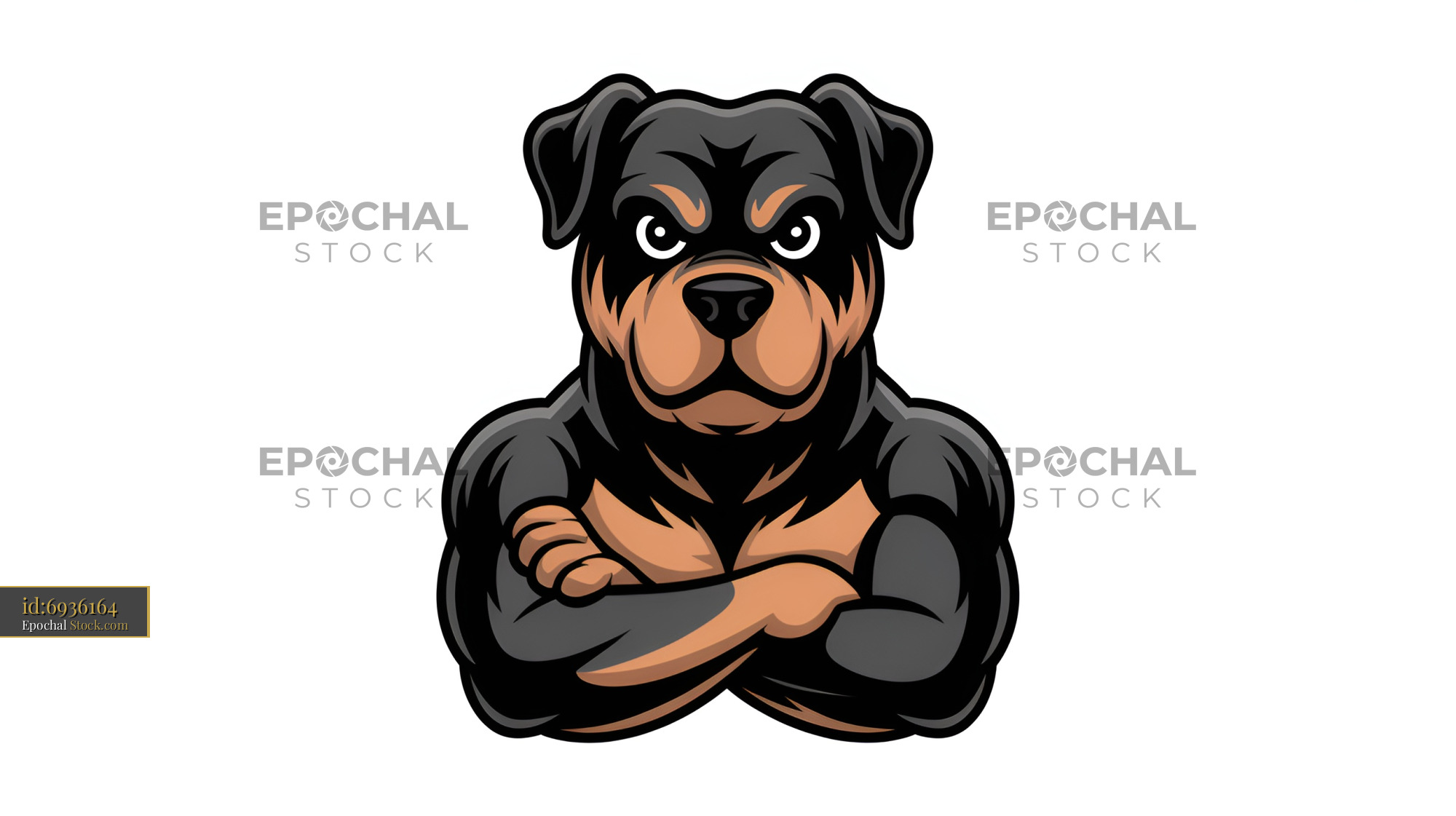 A cartoon character of a Rottweiler stands with muscular arms crossed. The dog has a focused expression and is shown in a strong stance. This image conveys strength and confidence.