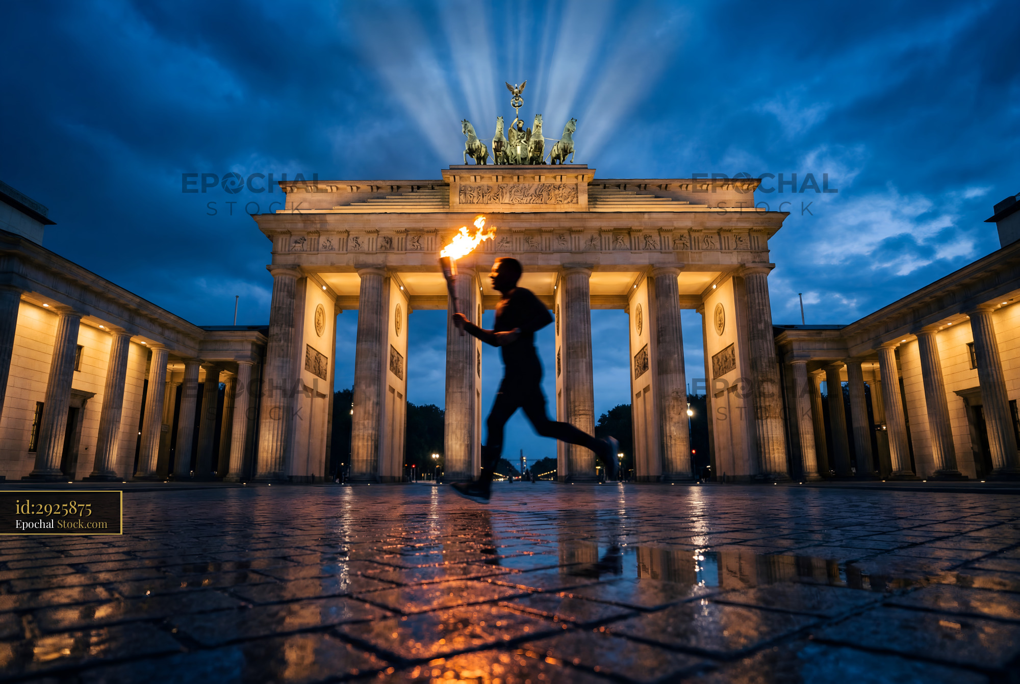 A person runs with a torch in hand. They are passing through the Brandenburg Gate in Berlin during the evening. The sky shows dark clouds and some light rays.