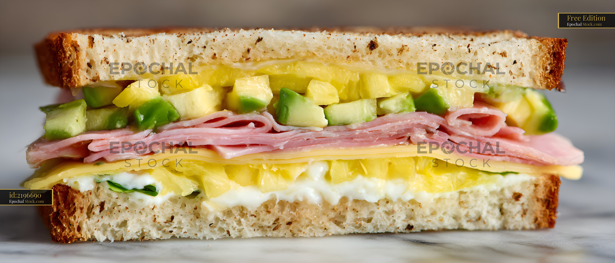 A sandwich is made with layers of ham, cheese, and vegetables. The bread is whole grain. The filling includes green pepper and pineapple. This item is served on a clean surface.