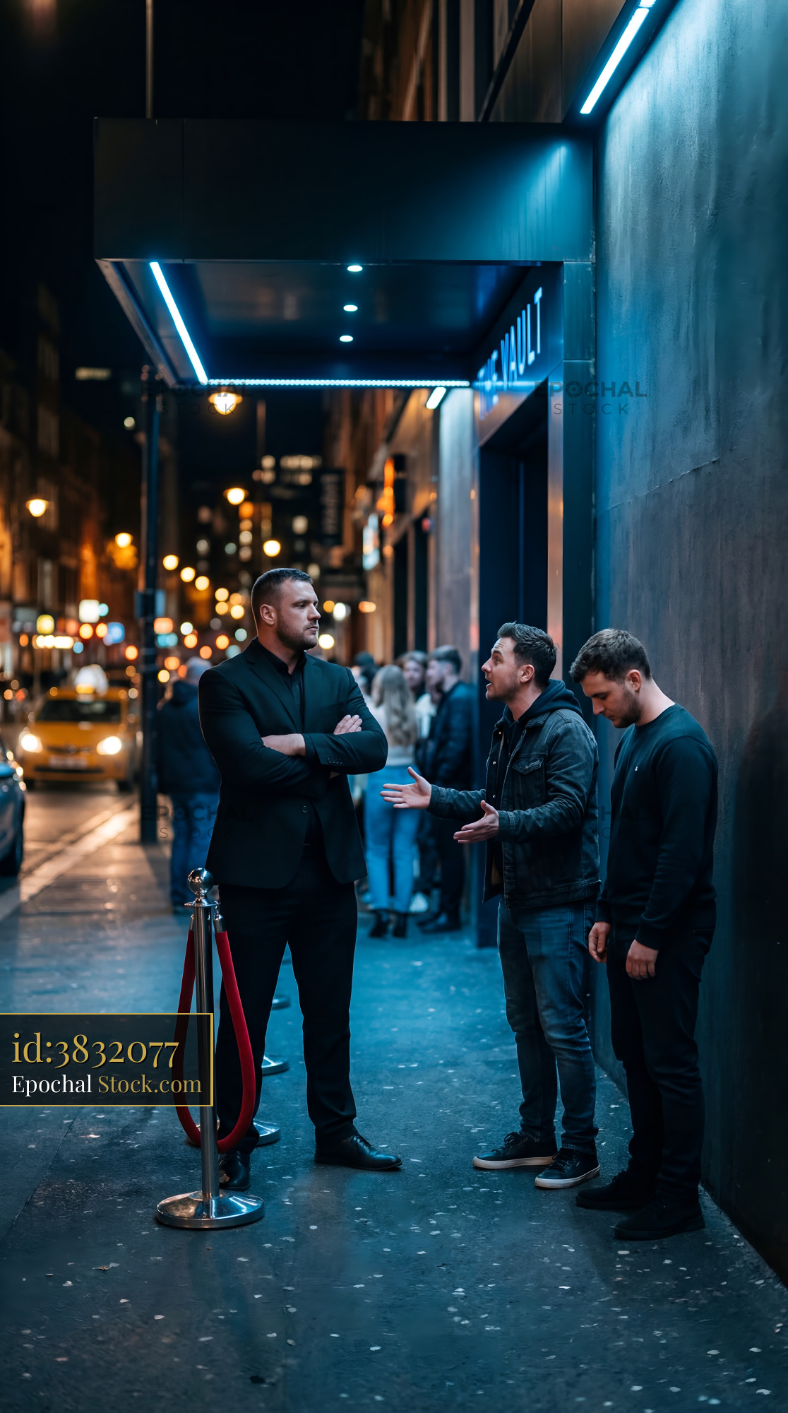 Two men stand outside a club while a security guard watches. People wait in line behind them. The street is busy with cars and lights shining at night.