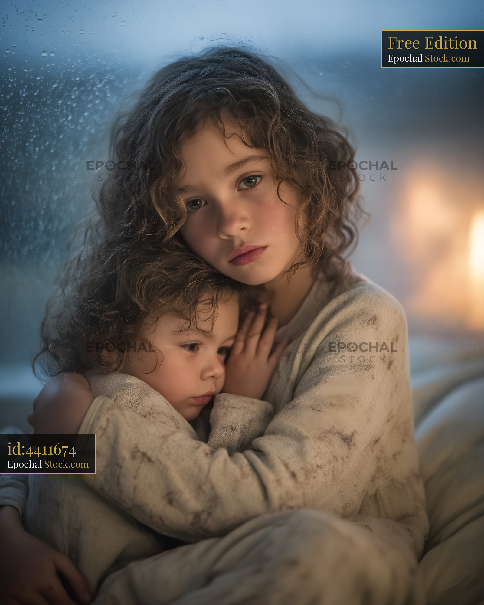 Two sisters sit close together on a bed as rain falls outside. The older sister holds the younger one, both wearing matching sleepwear. Soft light and cozy setting create a warm atmosphere.