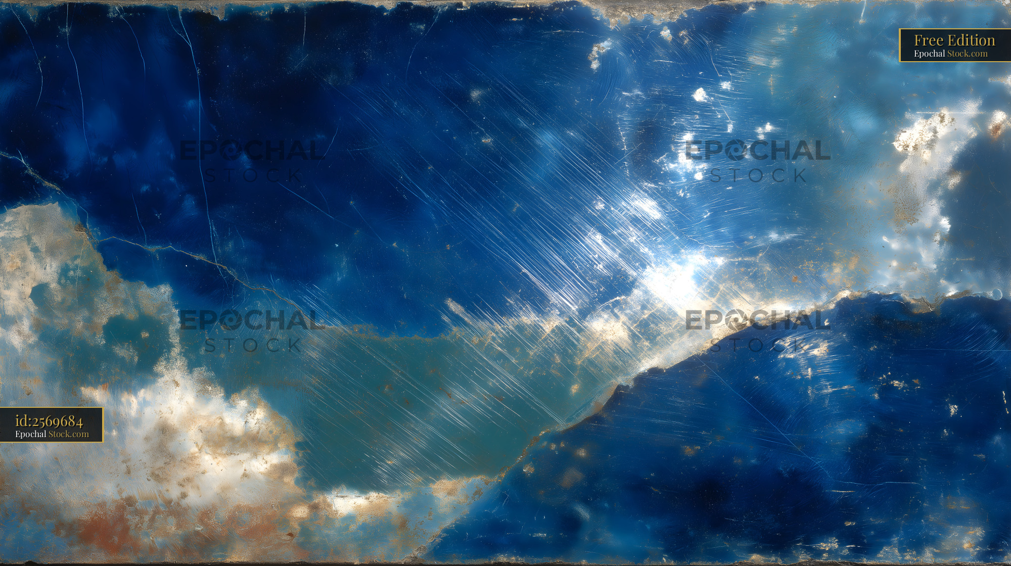 The scene shows a vast sky filled with various shades of blue and white clouds. Bright light shines through, creating natural patterns. The image captures the essence of daytime.