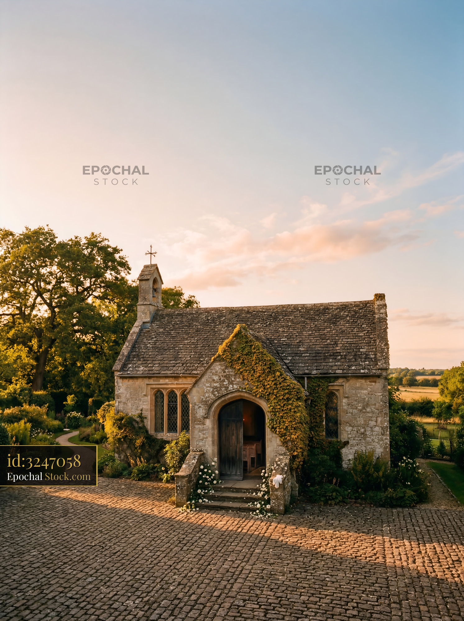 A small stone church stands in the countryside during sunset. Green plants cover part of the building. A path leads up to the entrance. The sky shows warm colors.