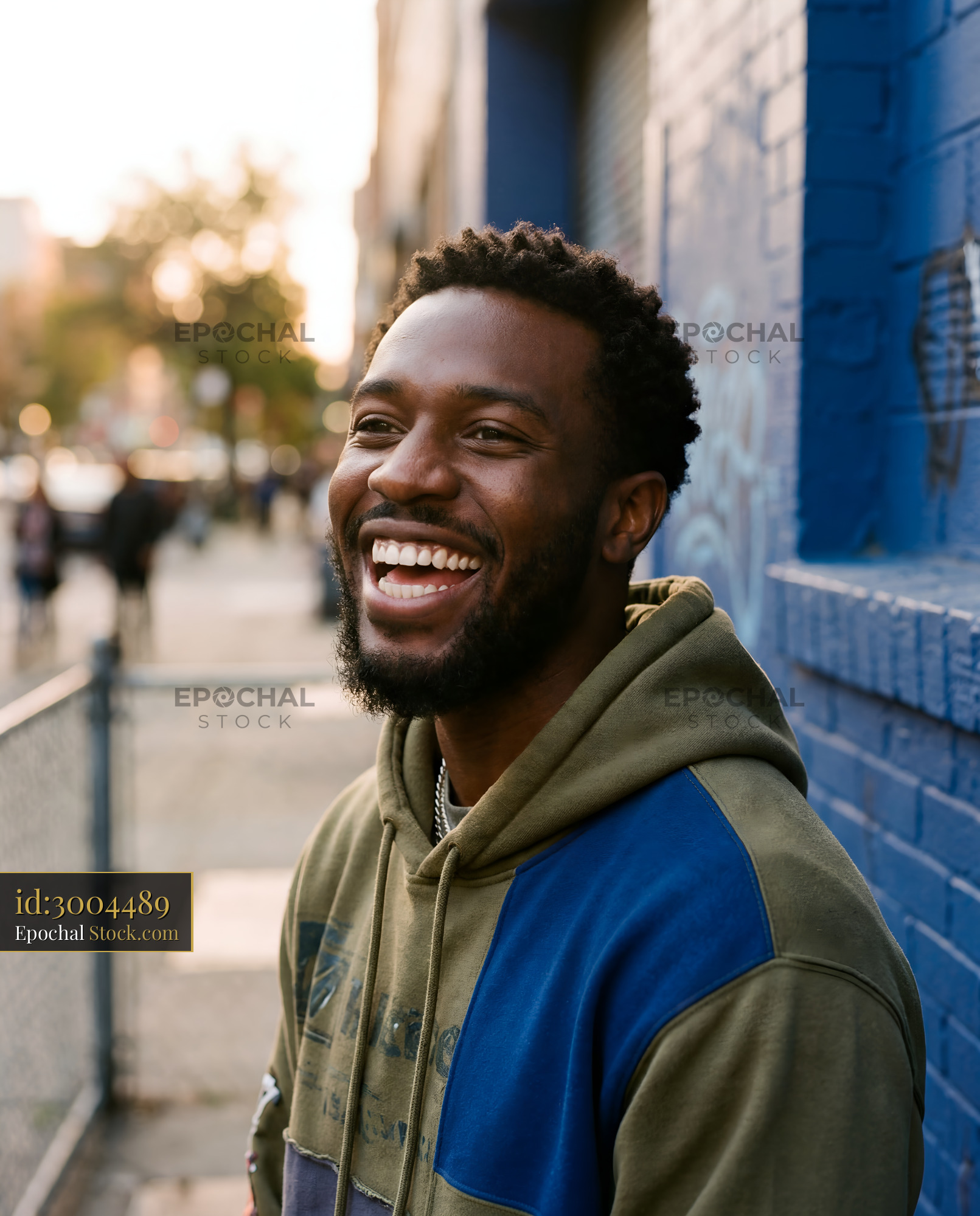 Smiling man stands near blue wall in city street during sunset Premium Stock Photo