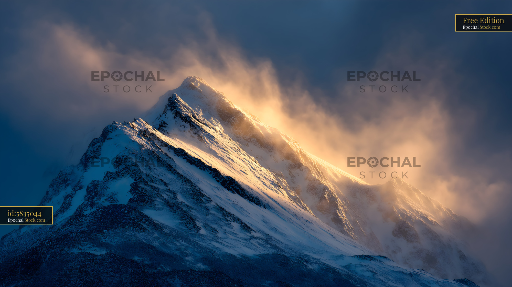 Snow covers the top of a mountain as clouds form around it during sunset. Light from the sun shines on the peak, creating a bright scene in the sky.
