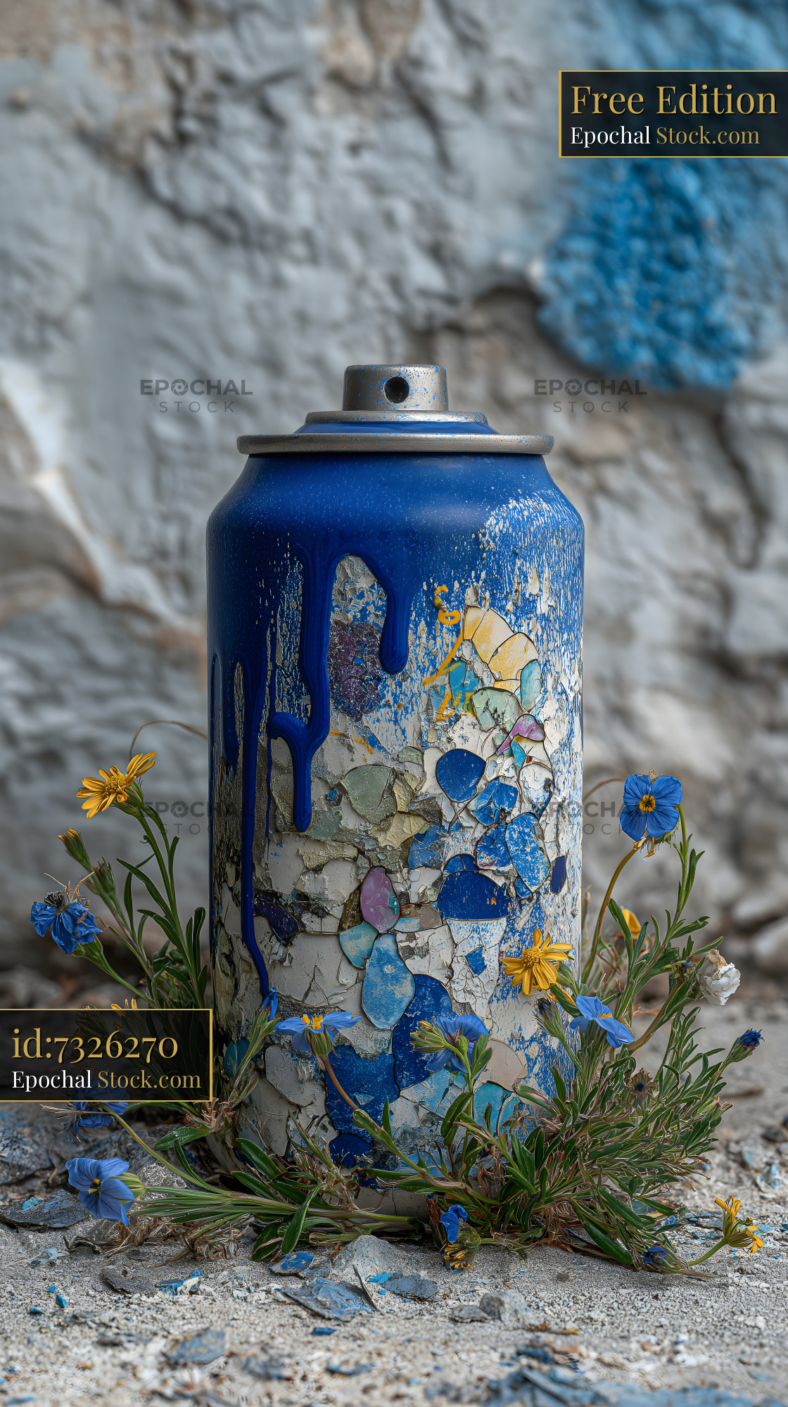 A blue spray can stands in a cracked surface. Small flowers grow around the base of the can. The scene shows a blend of nature and art in an outdoor area during daylight hours.