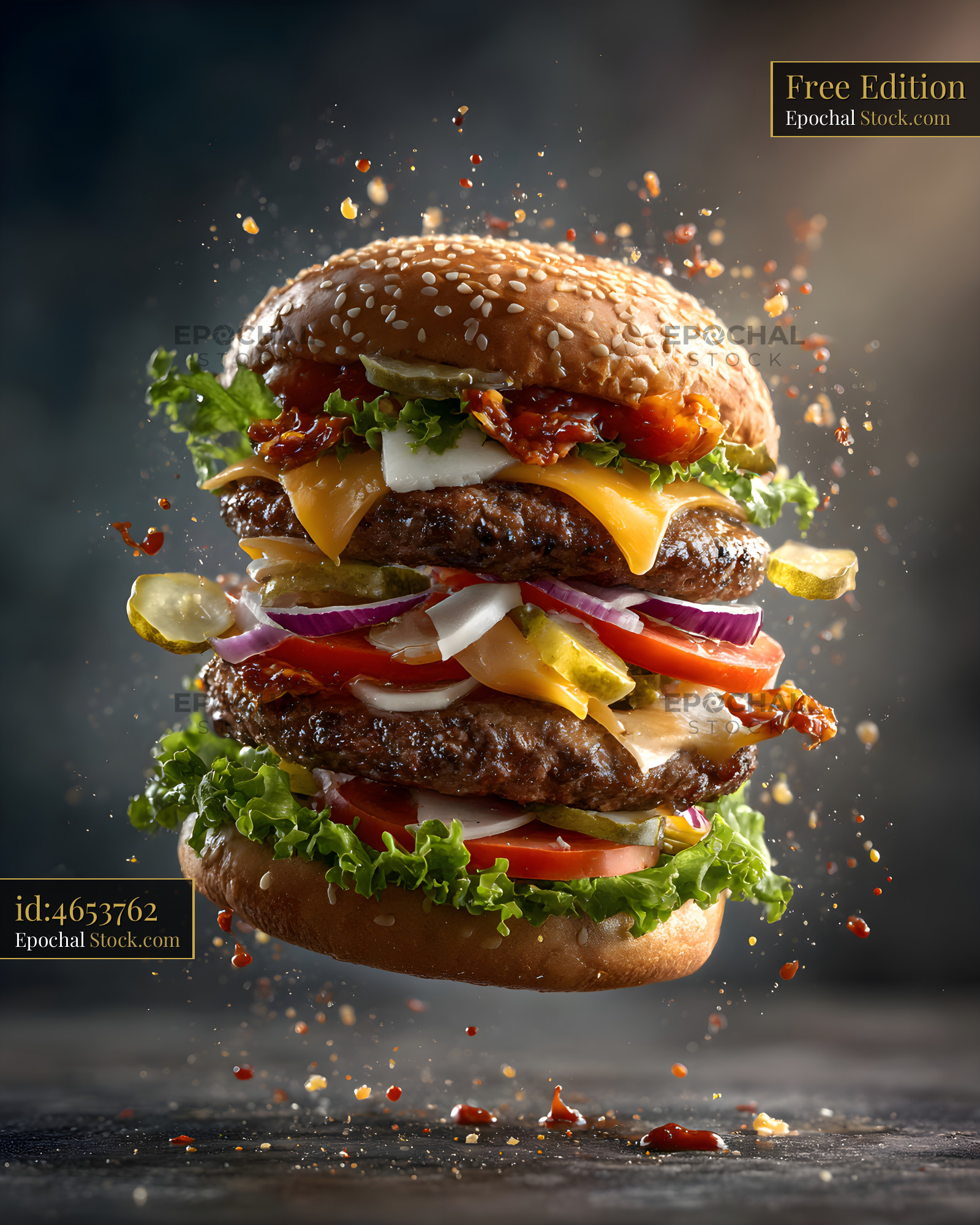 A large burger is suspended in mid-air. It has two beef patties, melted cheese, fresh lettuce, tomatoes, onions, pickles, and sauces floating around. The background is dark.