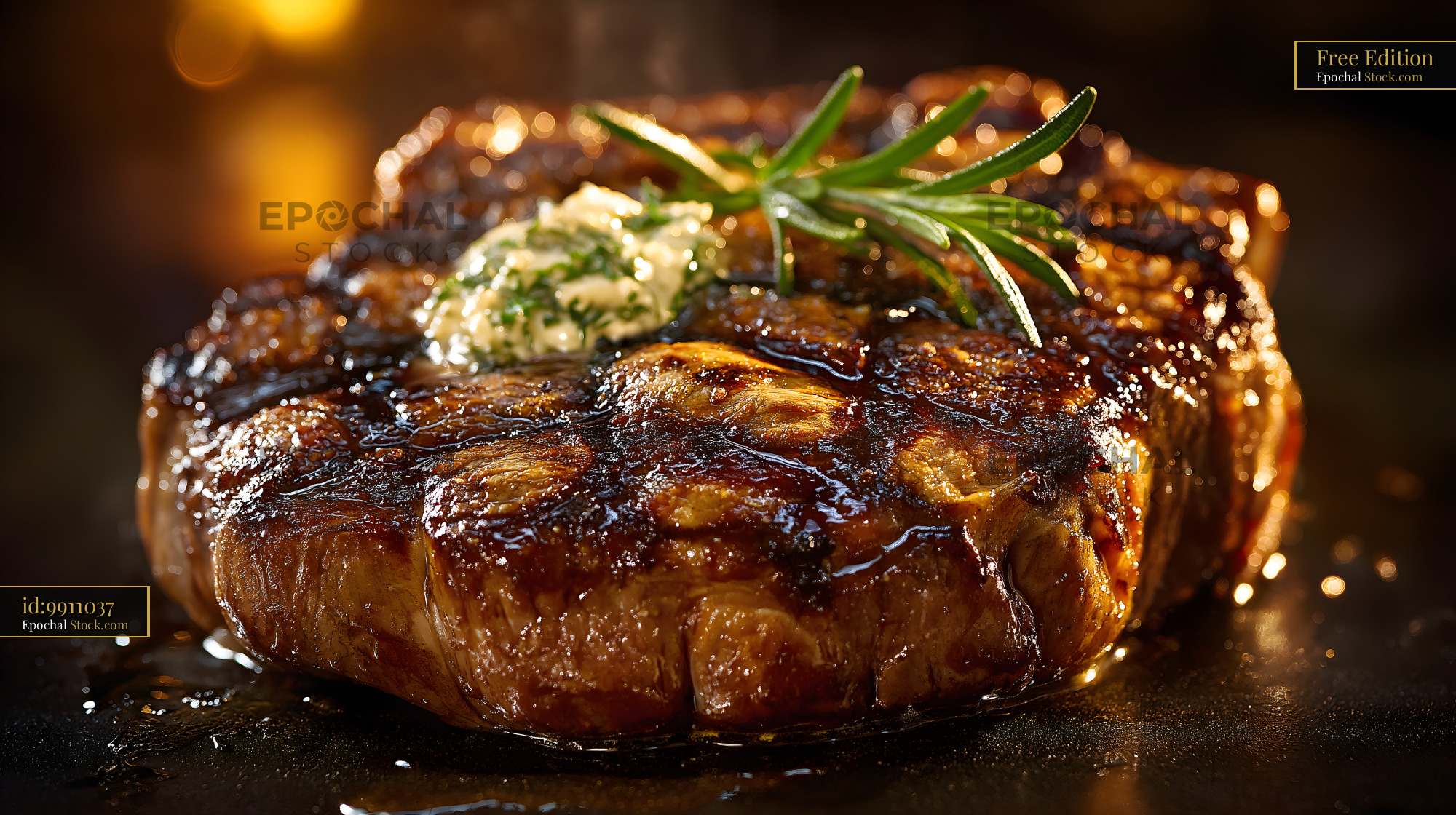 A thick piece of steak cooks on a hot grill. Fresh herbs and a dollop of butter sit on top. Smoke rises as the steak sizzles in a warm, dark kitchen setting.