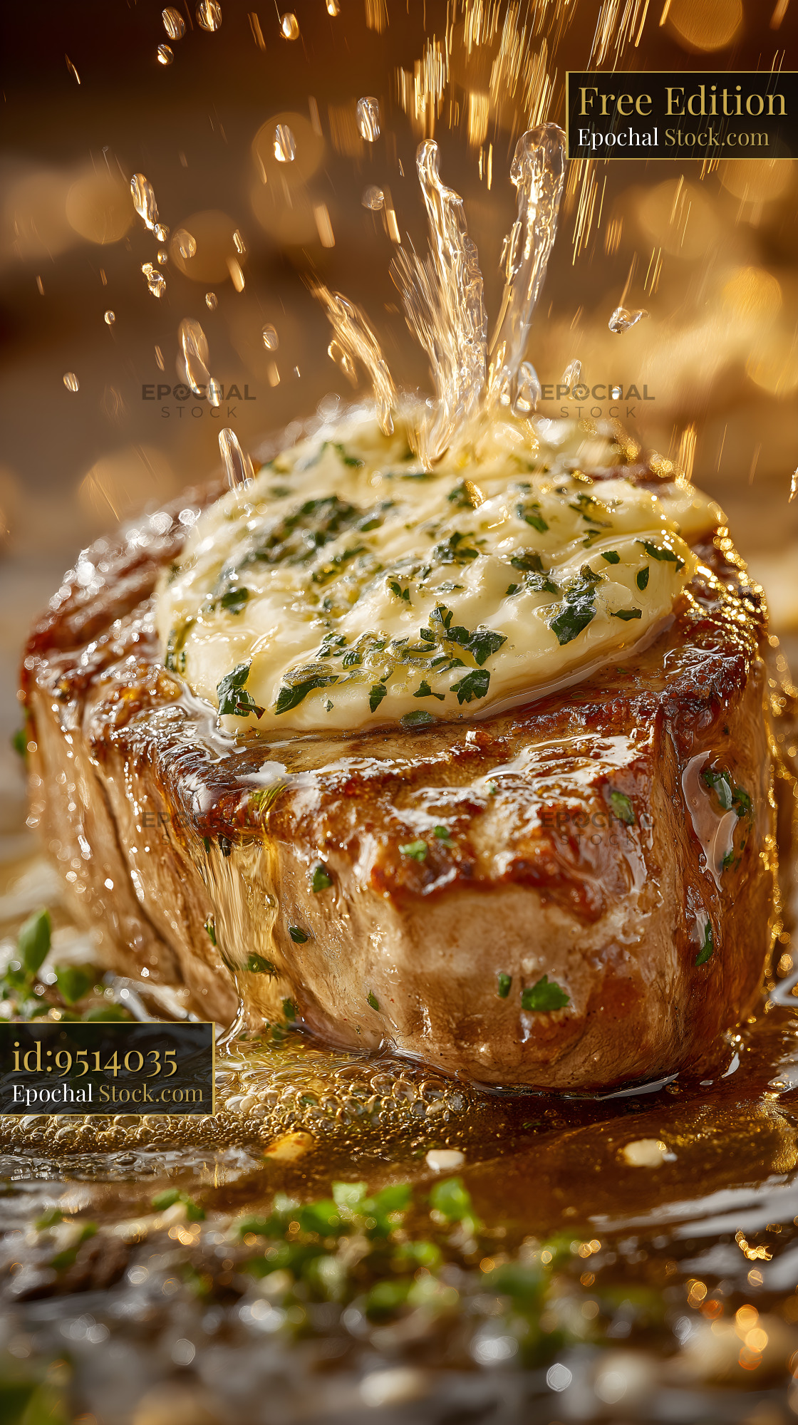 Steak cooking with butter and herbs in a warm kitchen Free Premium Stock Image