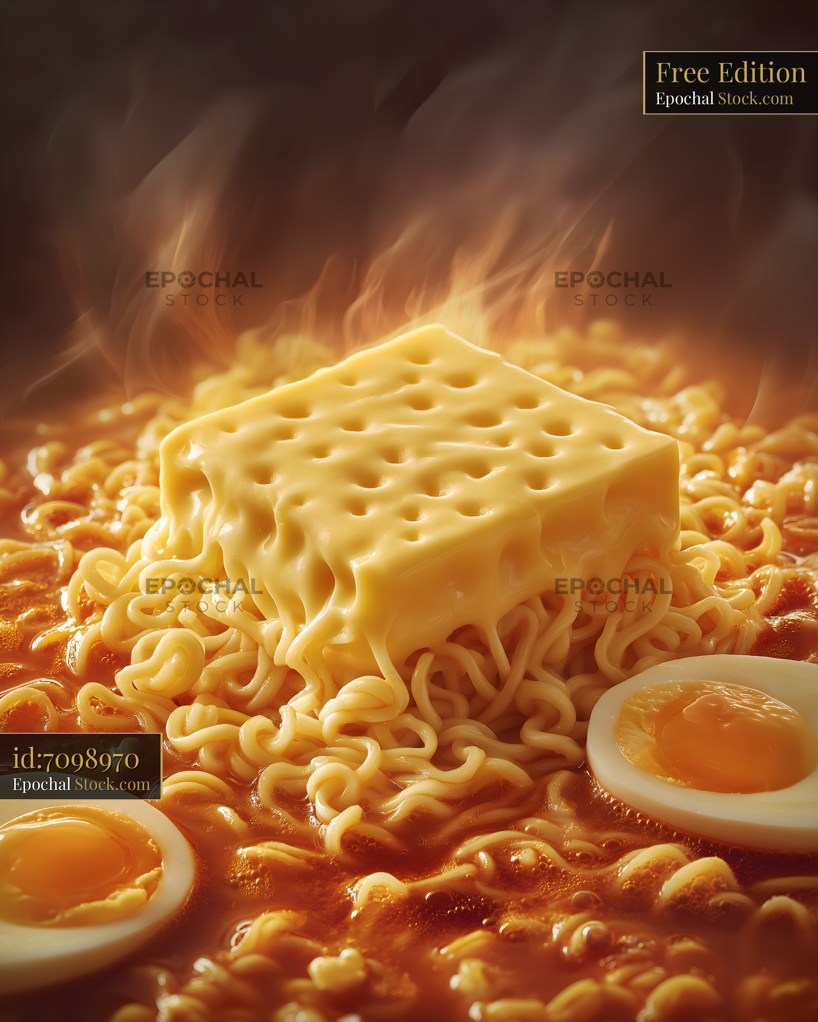 Noodles are boiling in a bowl, with a square of melted cheese on top. Two soft-boiled eggs sit beside the noodles, creating a warm dish in a kitchen setting.