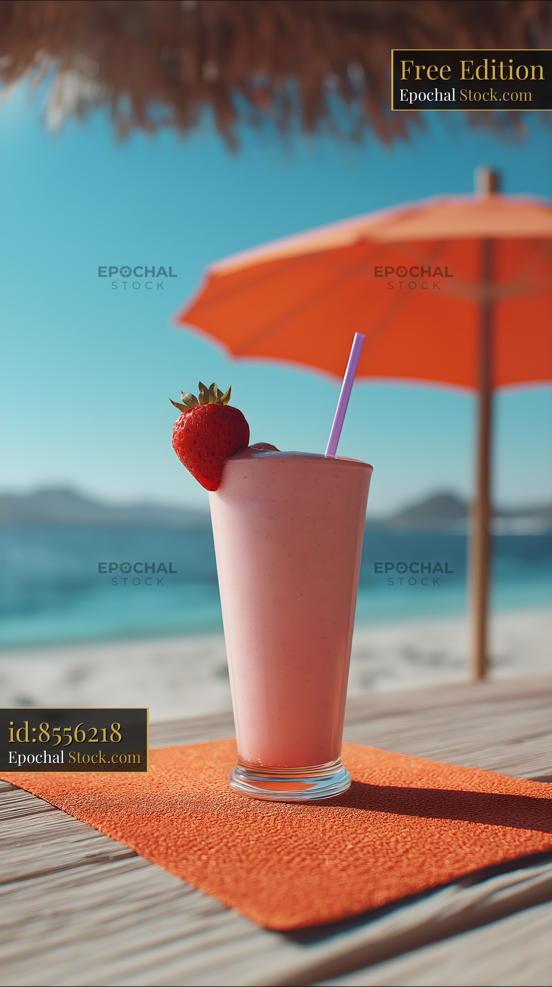 A strawberry shake sits on a wooden table by the beach. An orange umbrella provides shade. The ocean and mountains form a backdrop. It is a sunny day.
