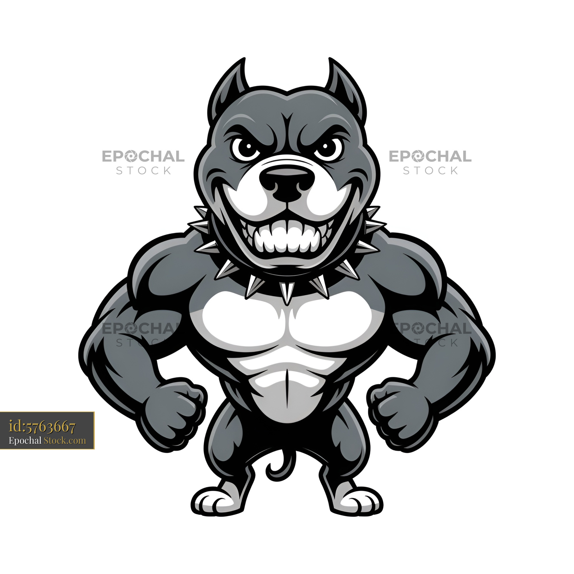 A cartoon-style dog stands with a strong pose. The dog has a muscular body, sharp teeth, and a spiked collar. It shows a fierce expression. The background is plain, focusing on the character.