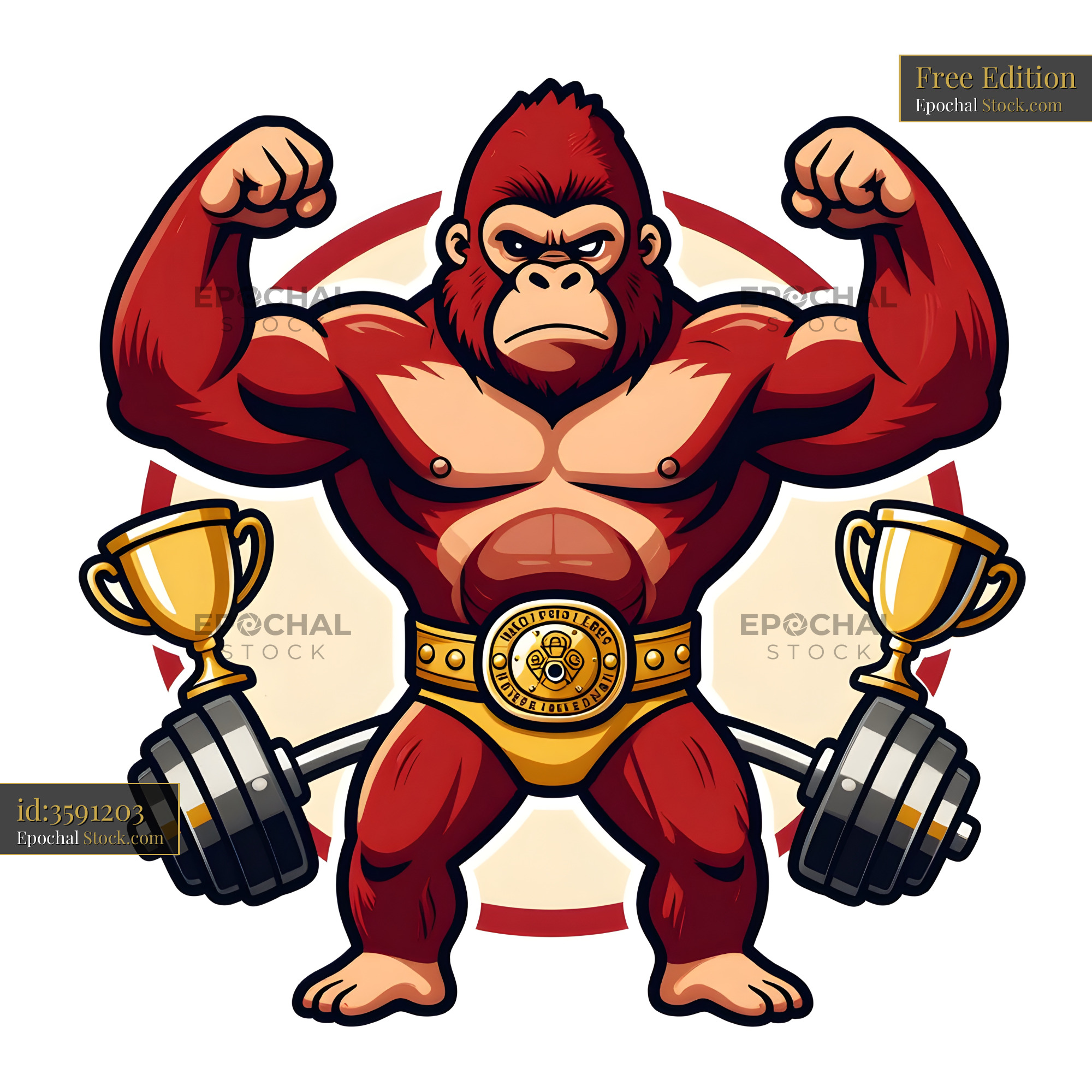 A gorilla poses with a strong stance, holding dumbbells and trophies. The background shows a circular design with a simple color scheme. This scene depicts fitness and strength.