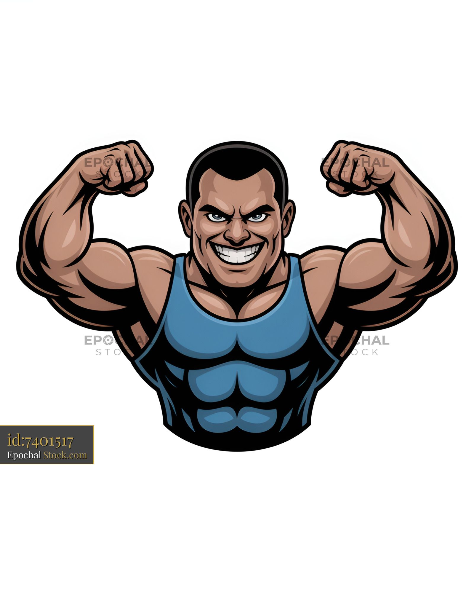 A man with strong muscles is flexing his arms in a fitness design. He has a big smile on his face and is wearing a blue tank top. This design shows strength and fitness.