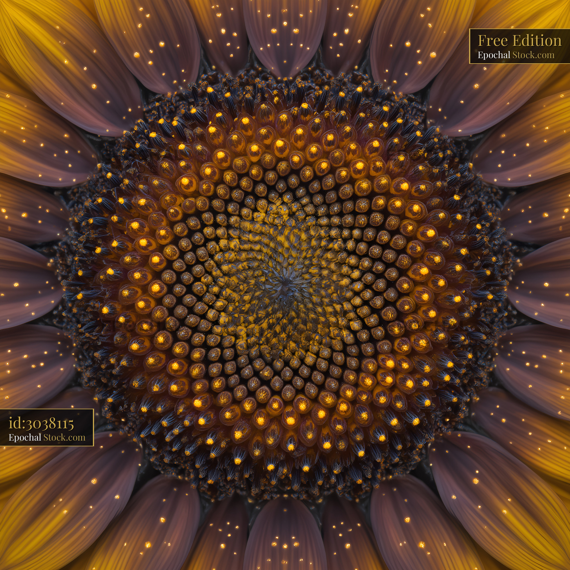 A sunflower displays its intricate patterns and textures. The center features small seeds and bright colors, while the petals create a circle around it. This scene captures the beauty of nature.