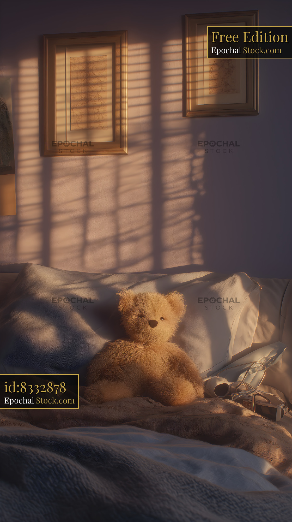 Sunlight falls on a teddy bear in a cozy bedroom setting Free Premium Stock Photo