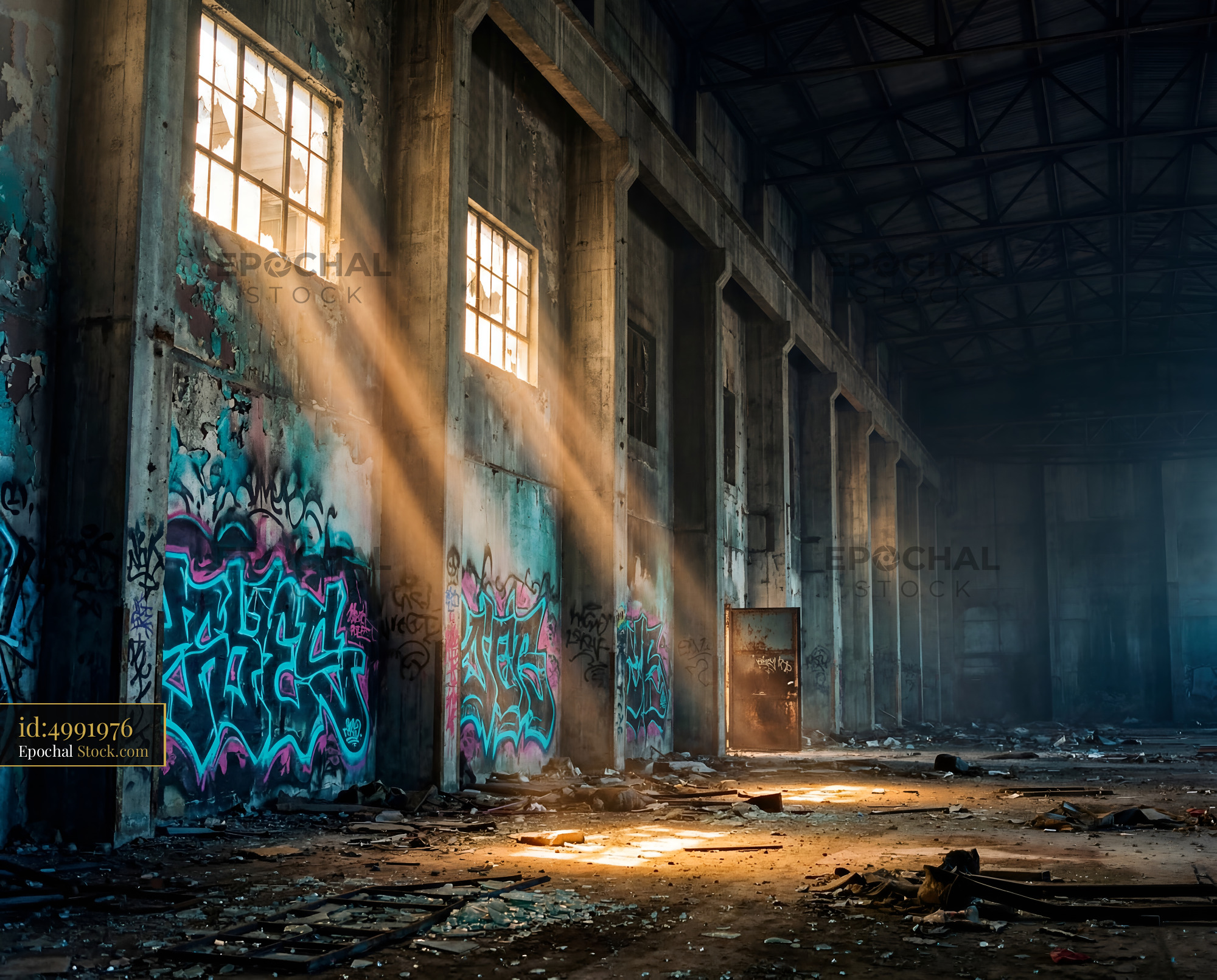 Light streams through windows in an old building. The floor is dusty and covered with debris. Colorful graffiti decorates the walls.