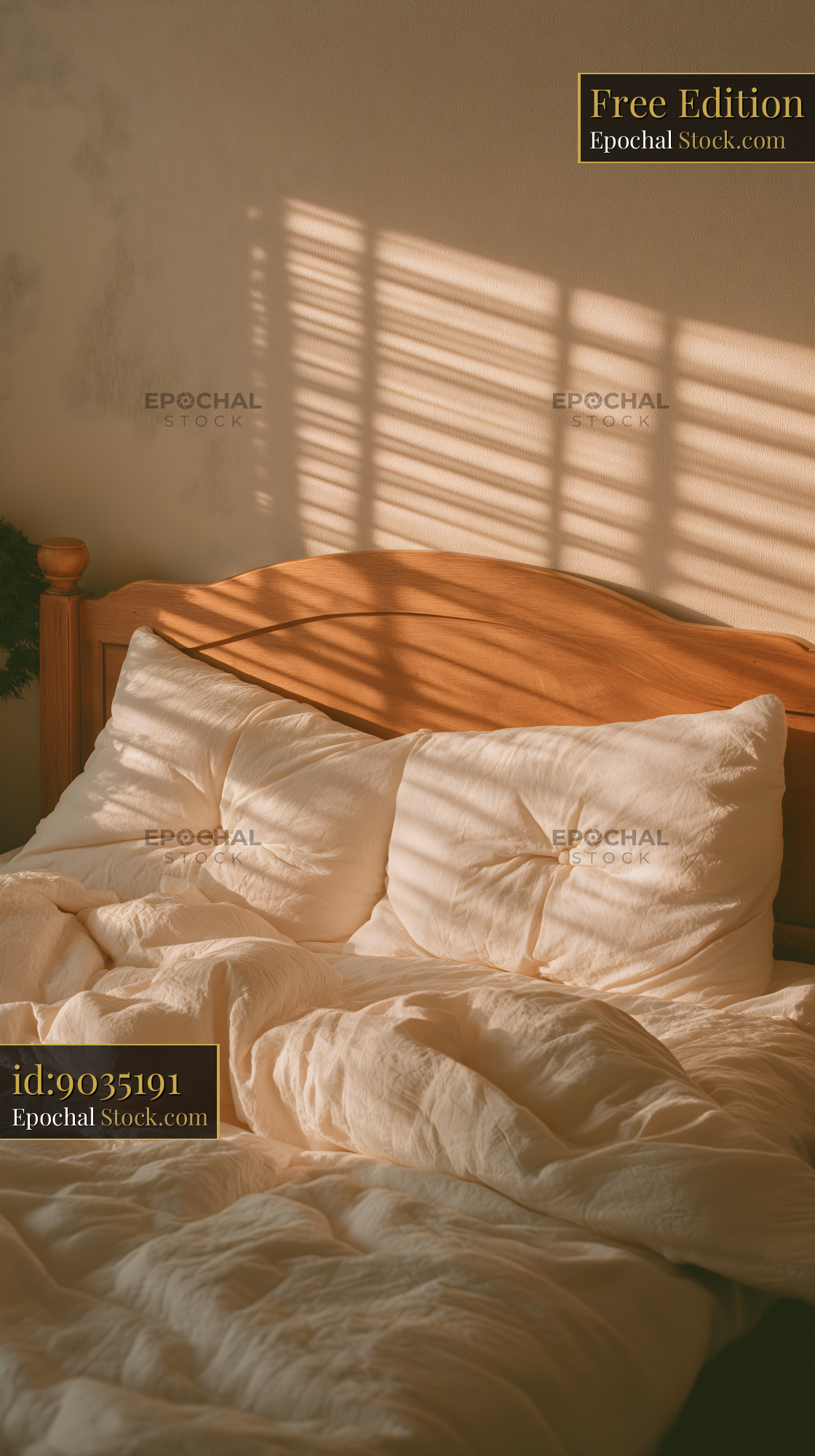 Sunlight filters through window blinds creating patterns on a bed with white pillows and a comforter. The room has a warm atmosphere in the morning.
