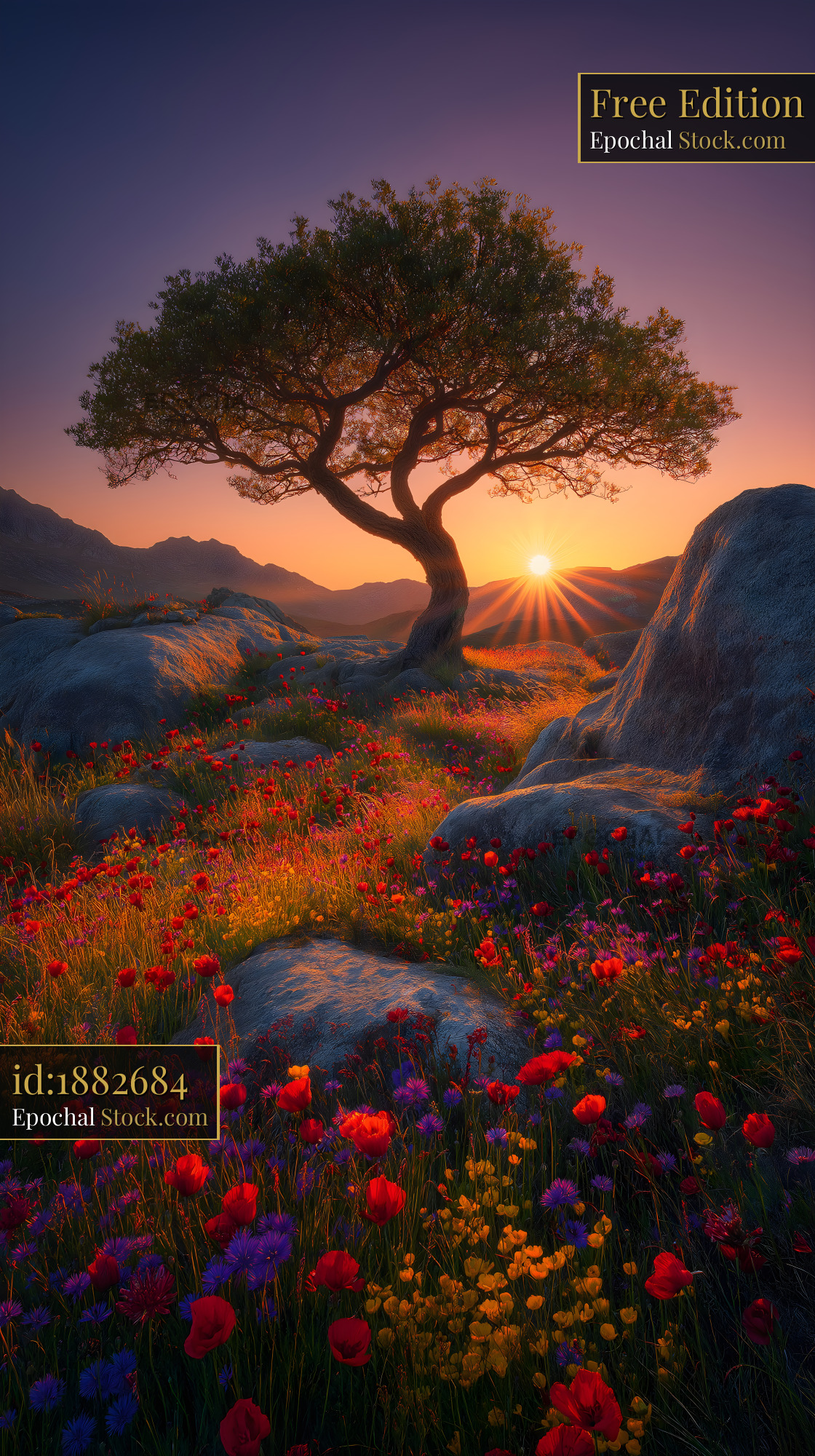 Sunrise over flowers and a tree in a rocky field Free Premium Stock Image