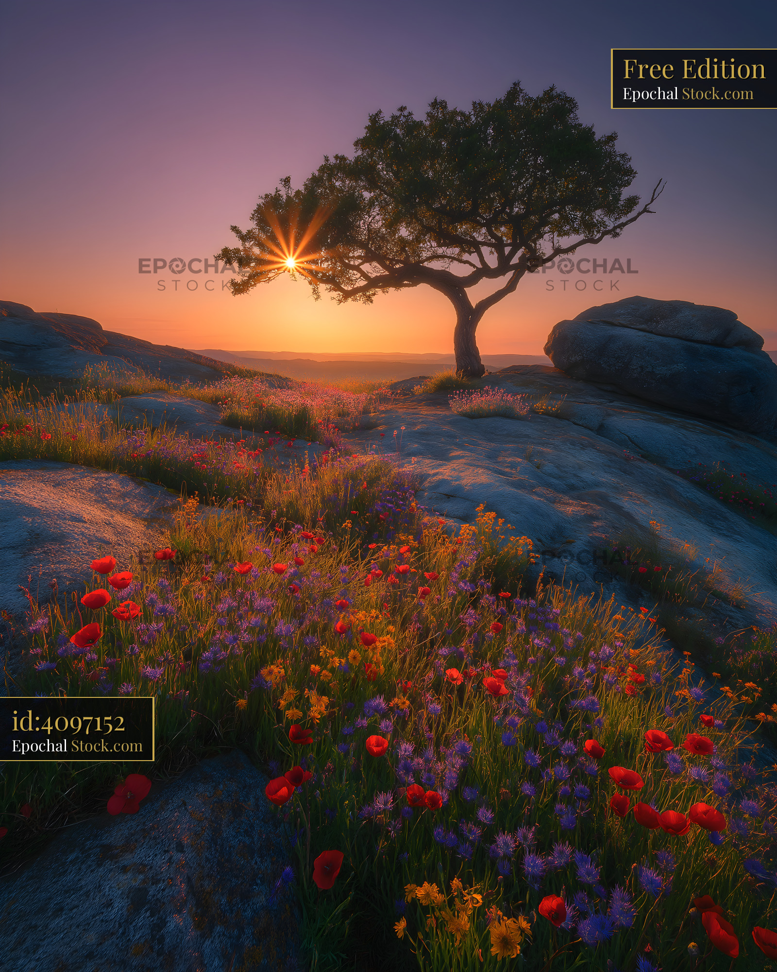 Sun rises over a rocky area with colorful flowers in bloom. A single tree stands tall, casting a shadow as light spreads across the scene. The sky shows warm colors as day begins.