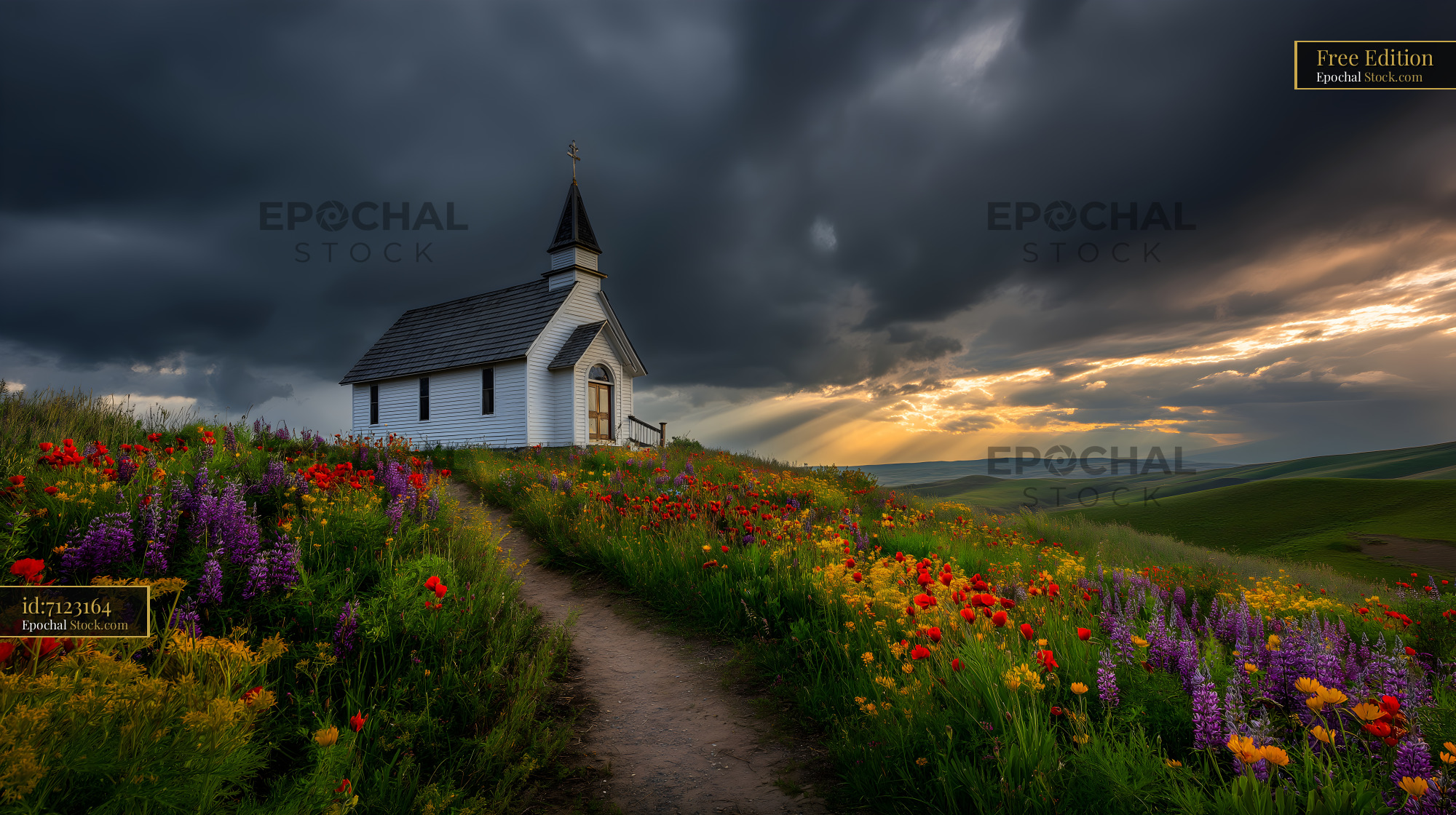 A small white church stands on a hill surrounded by many flowers. Dark clouds fill the sky while sunlight breaks through. The path leads to the church, creating a peaceful scene.