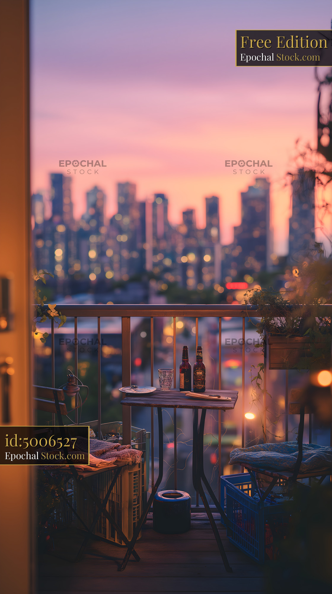 Two bottles are on a small table on the balcony. A chair sits nearby. In the background, tall buildings rise against the sky as the sun sets, creating a colorful scene.