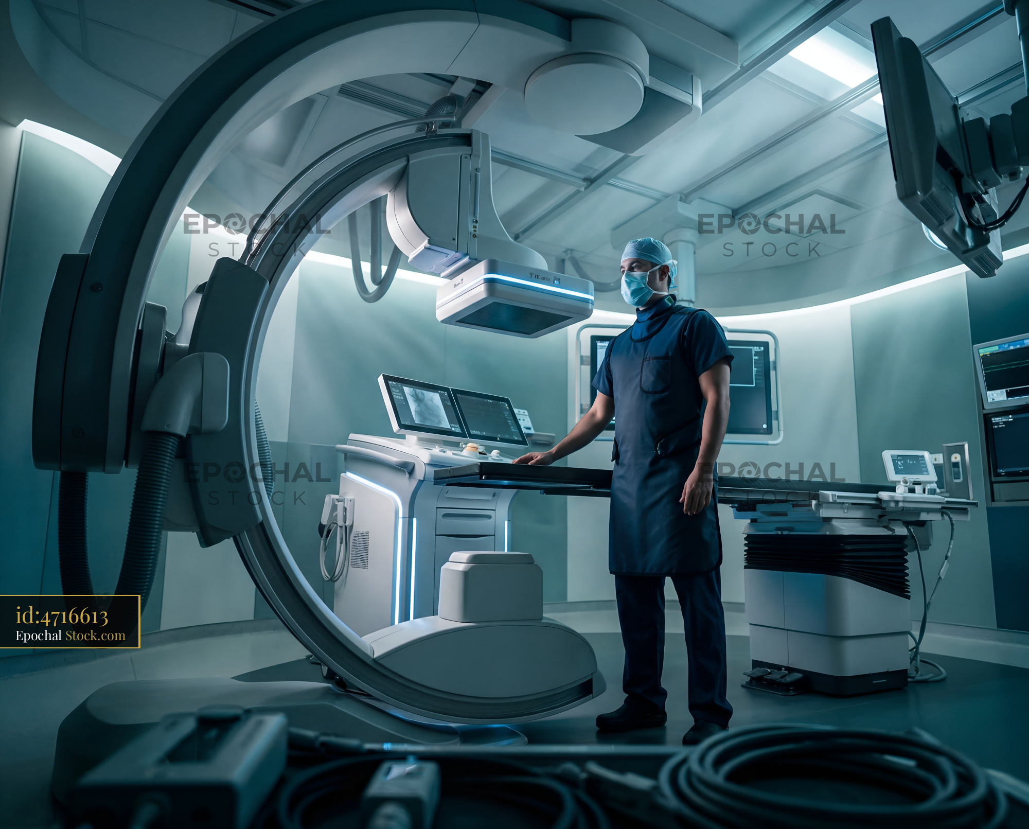 A surgeon in a surgical outfit stands by advanced medical equipment. The room is well-lit and designed for complex procedures. The scene shows preparation for a surgical operation.