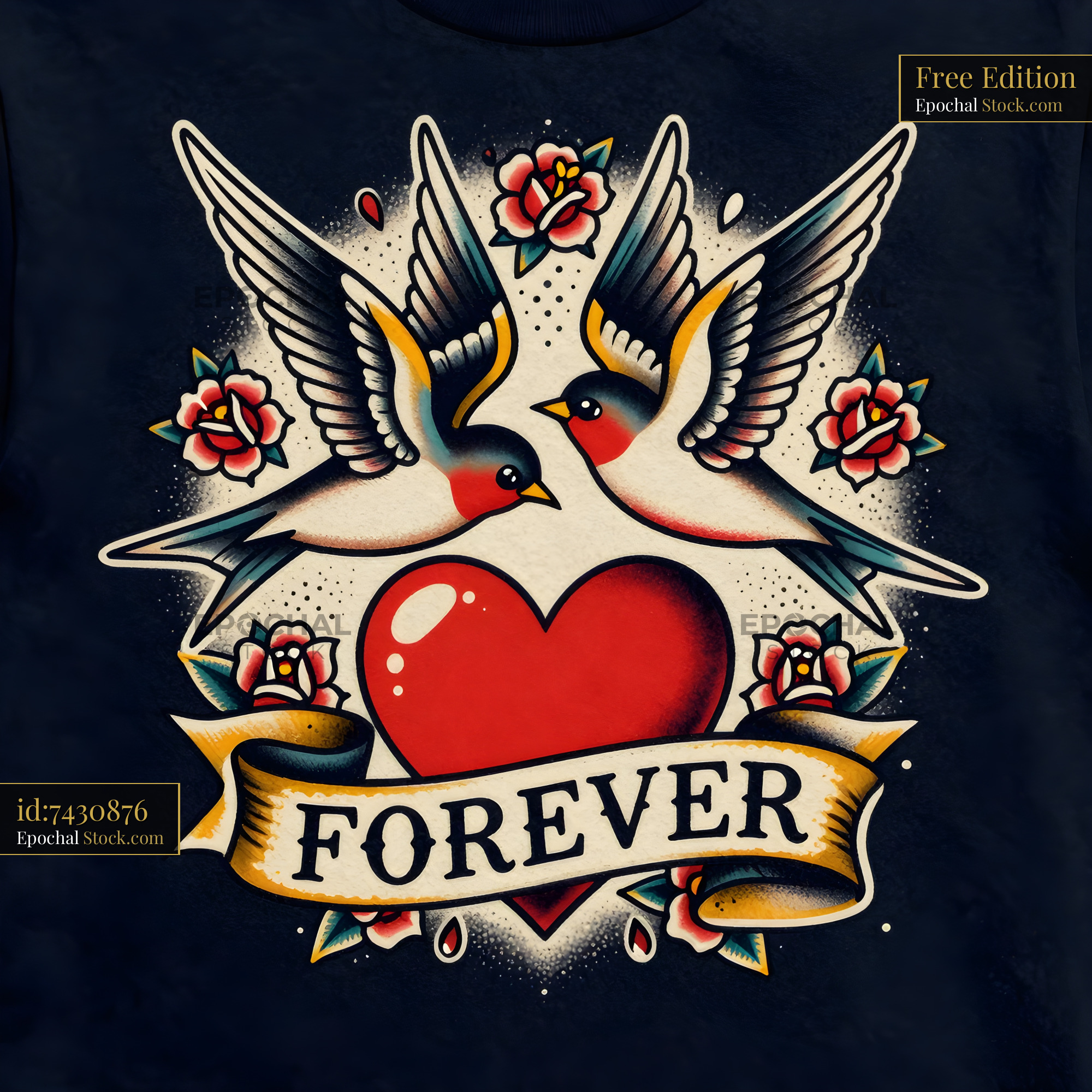 Two swallows fly around a red heart with a ribbon that reads forever. This design features colorful roses and is displayed on a dark background.