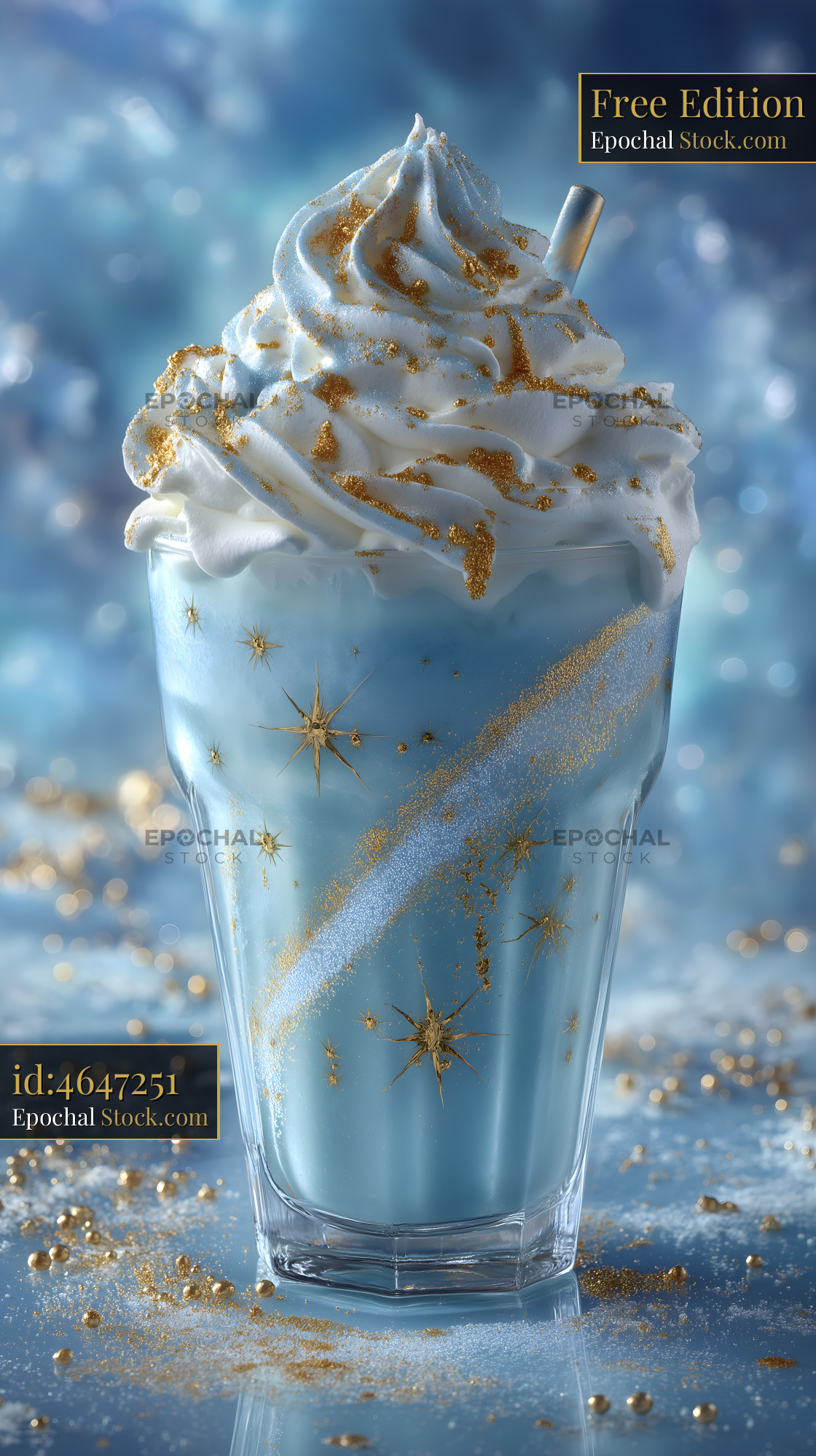 A blue drink with whipped cream and gold dust sits in a clear glass. It is decorated with a straw. The background shows soft blue hues and sparkles.