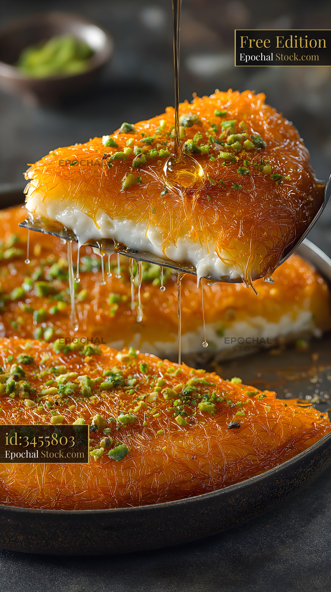 A dessert is served in a round dish. A slice is lifted with a spoon and syrup is poured over it. The dish has nuts on top. The setting looks warm and inviting.