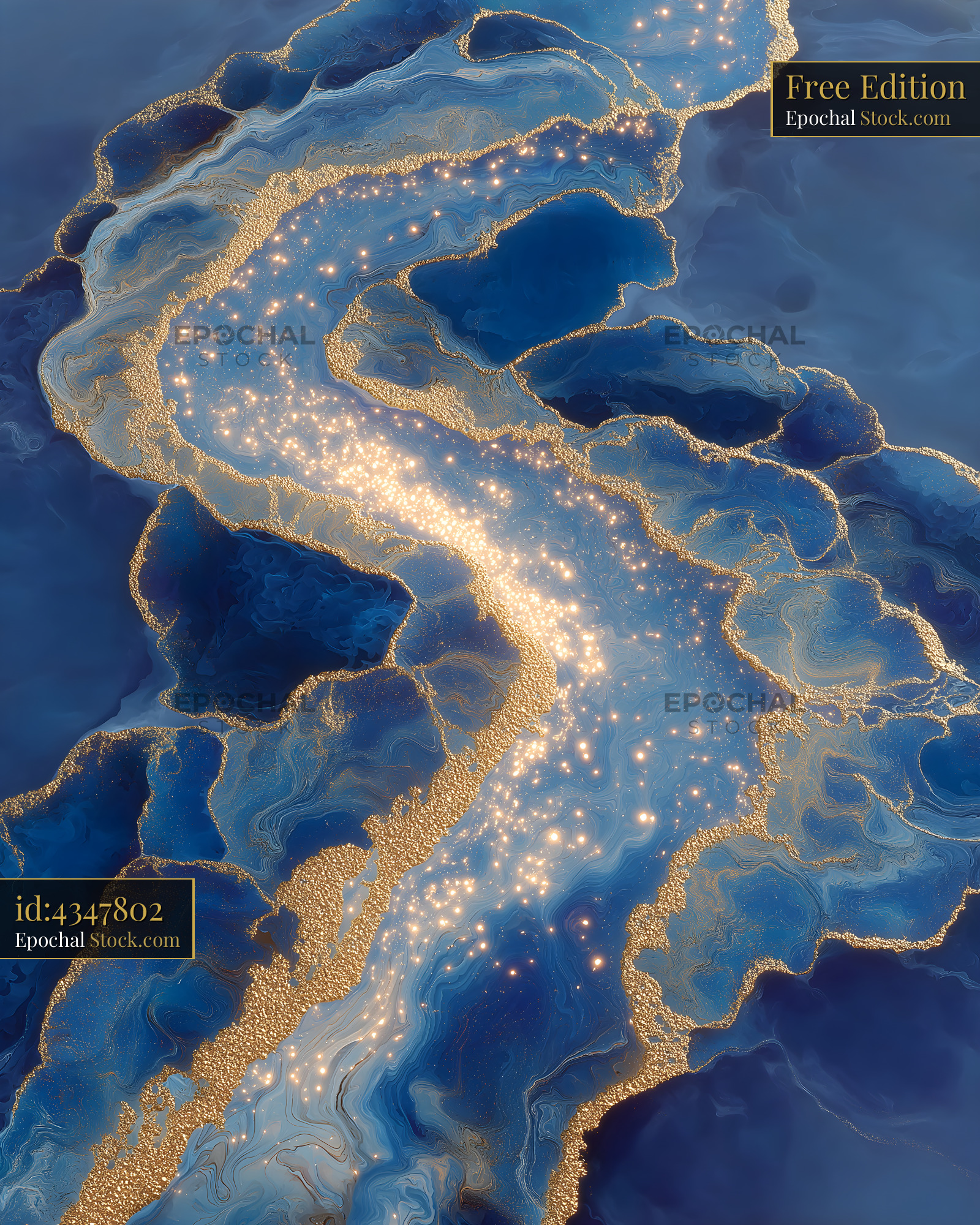 Bright blue shapes flow together with golden highlights. The pattern shows a river-like design with sparkling areas. This artwork combines colors in smooth forms.