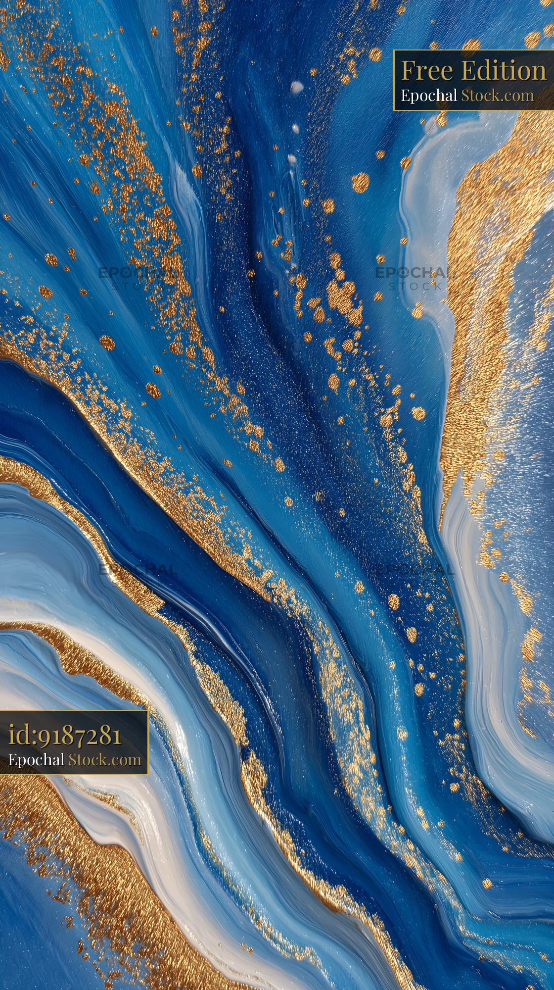 Colors blend together in waves of blue and white with touches of gold. The design features fluid lines and gold specks, forming an interesting abstract pattern.