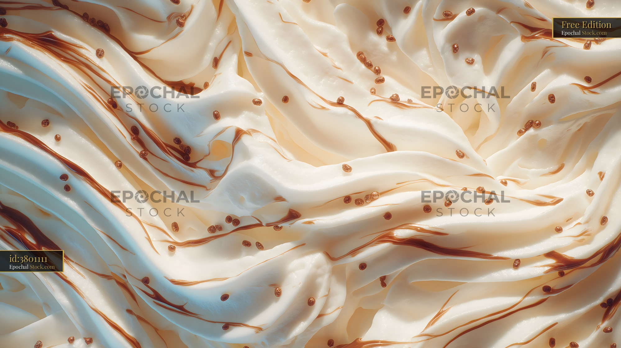 The scene shows a close-up view of swirls of cream with lines of chocolate and tiny gold sprinkles. The texture appears smooth and layered, creating a rich look.