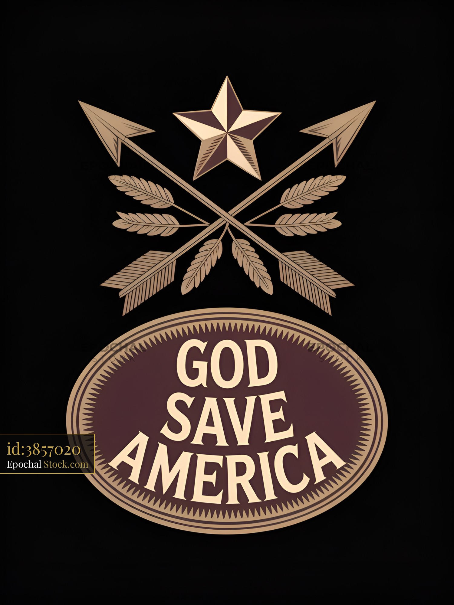 A design shows a star above crossed arrows and wheat. The text below reads God Save America. This artwork represents themes of unity and national pride.