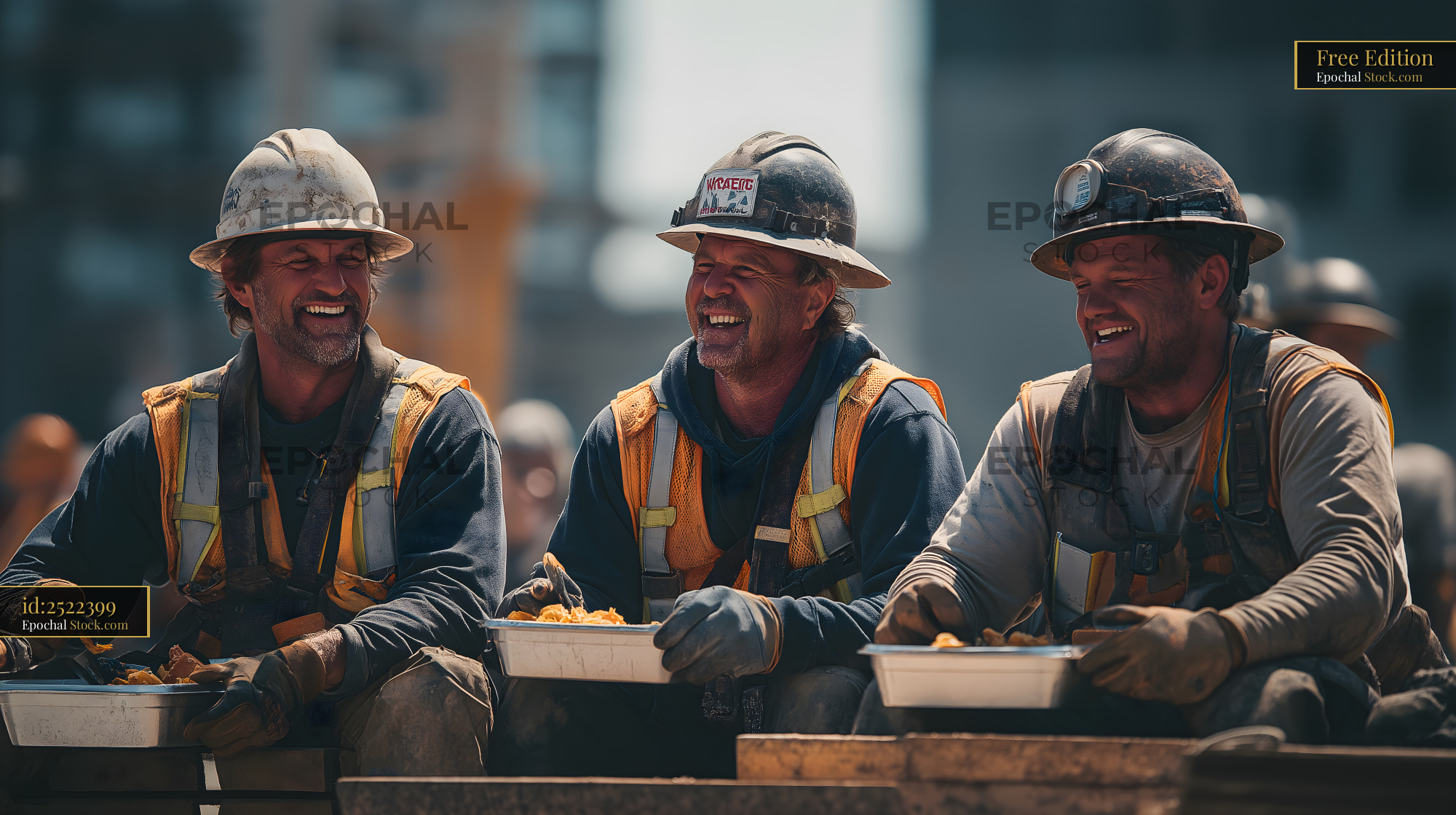 Three workers sit together on a construction site during their lunch break. They enjoy their food and share laughter while wearing hard hats and work clothes.