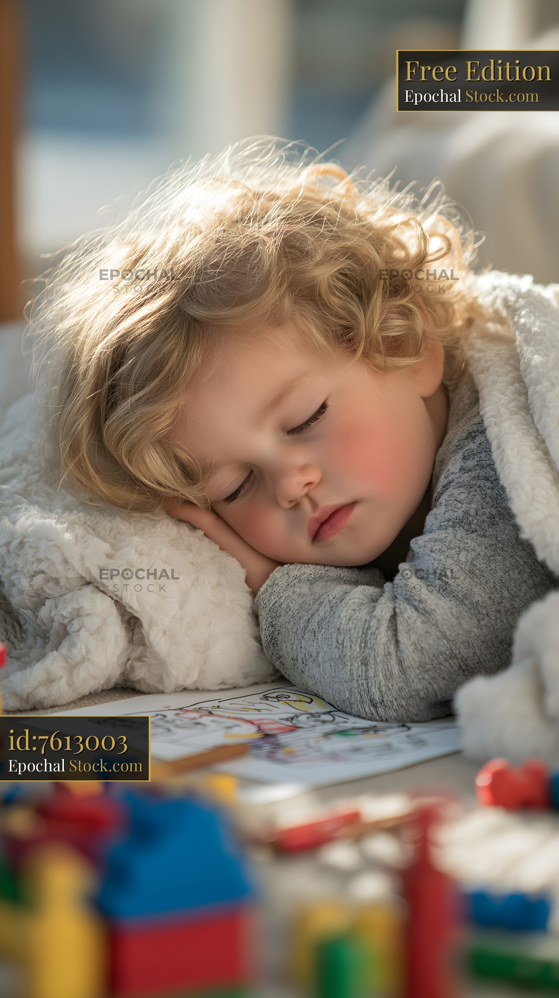 A young child with blonde curls sleeps deeply on a soft white blanket. Warm sunlight brightens the scene, highlighting their peaceful face.