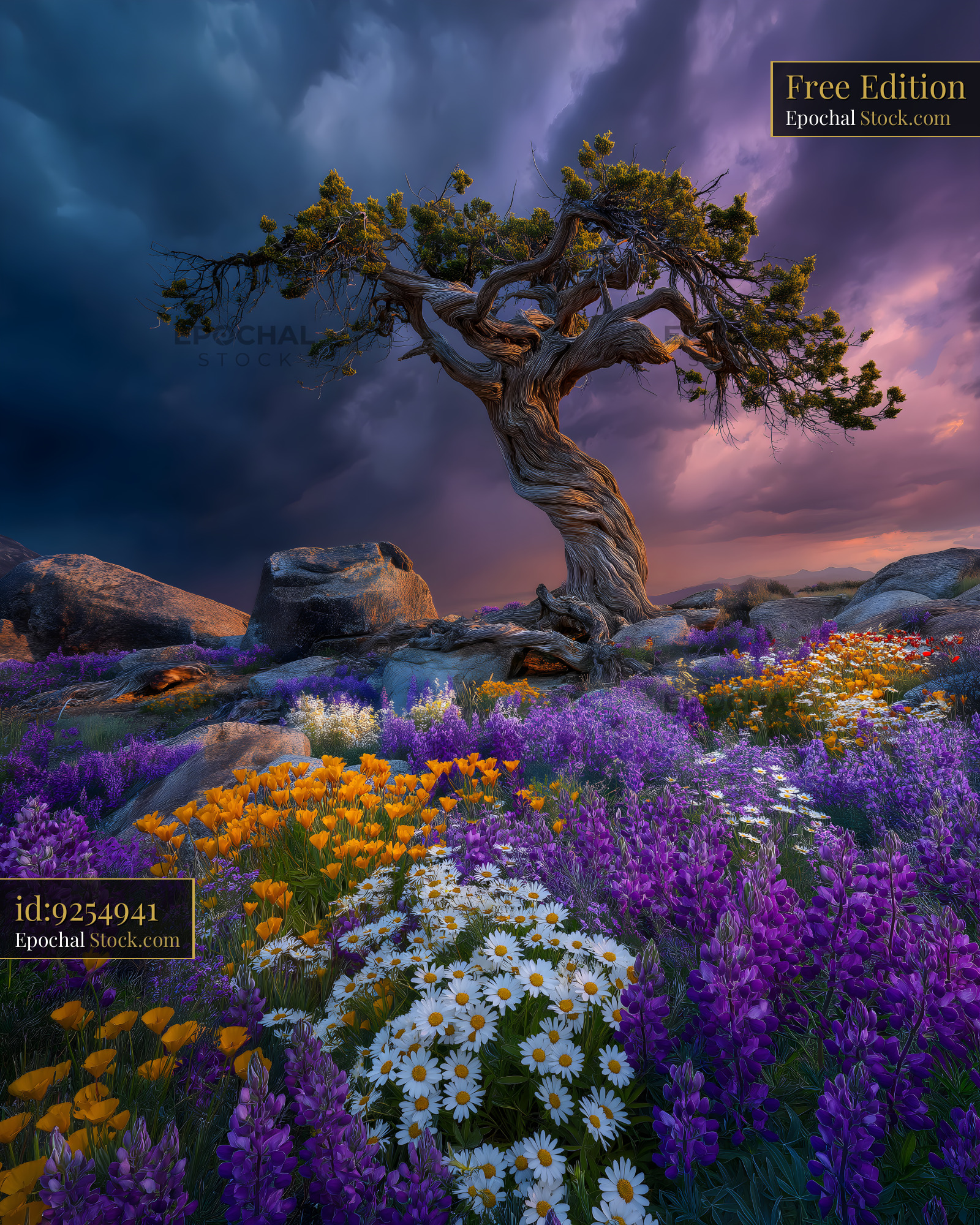A tree with twisted branches rises above a field of flowers. Bright yellow, purple, and white blooms cover the ground. Dark clouds loom in the sky as the sun sets in the background.